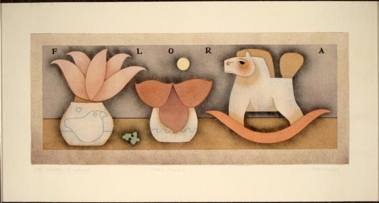 Pot with a bird design + puzzle piece + pot with a water design + Rocking Horse = Flora Puzzle. Artist: Carol Jablonsky Title: Floral Puzzle Medium: Print on Paper Signature: in pencil, lower right Dedication: "Mauro Siuffrida" - lower left Size: 14 3/4" x 18 1/2" Condition: Very Good, been stored BiographyA well known contemporary sculptor, etcher and lithographer, Carol Jablonsky went to college in Boston. She studied art in San Miguel de Allende, Mexico in the early 1960's. Jablonsky also first began to experiment with original printmaking techniques during this period. Since that time, Carol Jabolonsky's graphic art has been widely exhibited in both the United States and in Mexico.