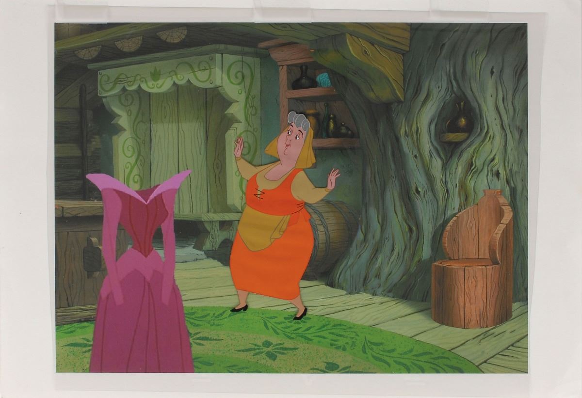 (Walt Disney Studios, 1959) Original production cel from Sleeping Beauty, showing a full-length pose of Flora inside a stunning woodwork cabin. The cel is placed on a color copy background. The cel is slightly trimmed to 16.25 x 12.5. Image measures 3.5 x 6.75, with overall dimensions of 19 x 13. In fine condition.