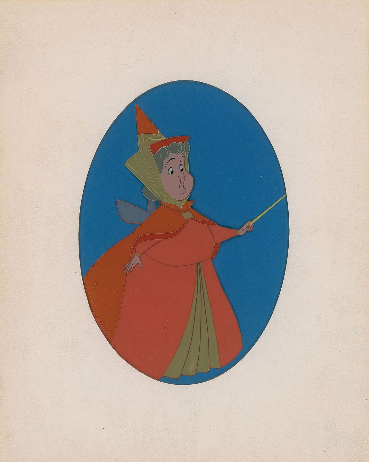 (Walt Disney Studios, 1959) Original production cel featuring Flora from Sleeping Beauty, showing her at full-length in her fairy outfit with wings and magic wand. The cel is placed on a solid blue background. Image measures 4.5 x 6, with a mat opening of 4.5 x 6. Mat dimensions are 8 x 10. In fine condition. An ideal pose of Princess Aurora's good orange fairy godmother.