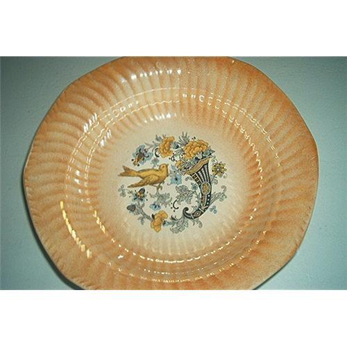 Beautiful bowl is decorated on the bottom inside with flowers, yellow bird, cornicopia, and full of colored flowers. The Cornicopia is colored Black, Yellow, & Grey. Lovely vines and flowers form the outside edges of the Bird and Cornicopia. Florigold ribbed bowl with beautiful inside decorative items. Measures 9 1/8 inches in diamter; depth measures 2 inches (not counting the edges). Base diameter measures 4 1/2 inches The bottom is stamped in green, C.C.T.P. Company, along with a star which has U.S.A. on the inside. No chips or cracks, etc. Excellent Condition.