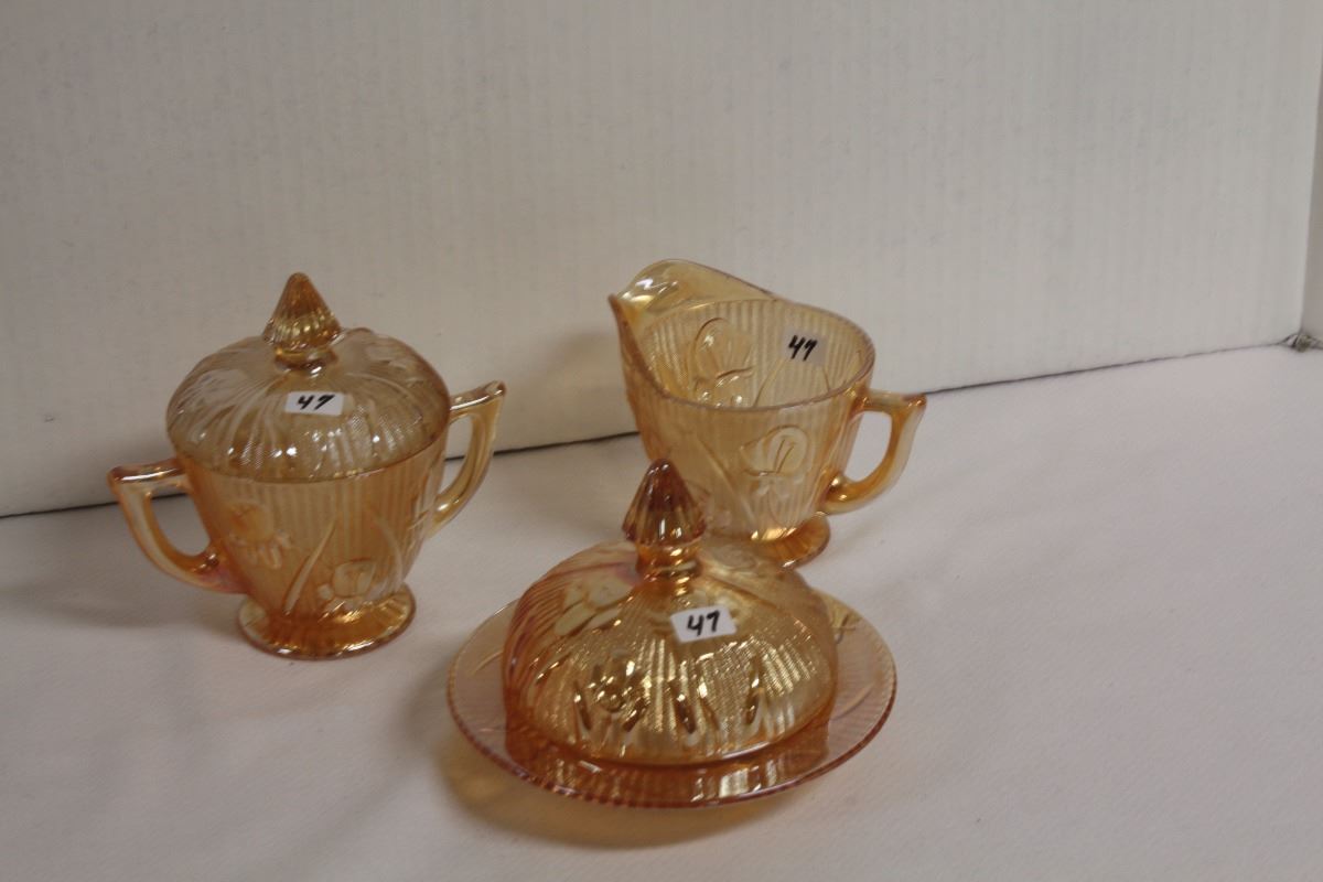 A three piece iris herringbone Marigold table set with creamer, sugar, and covered butter dish