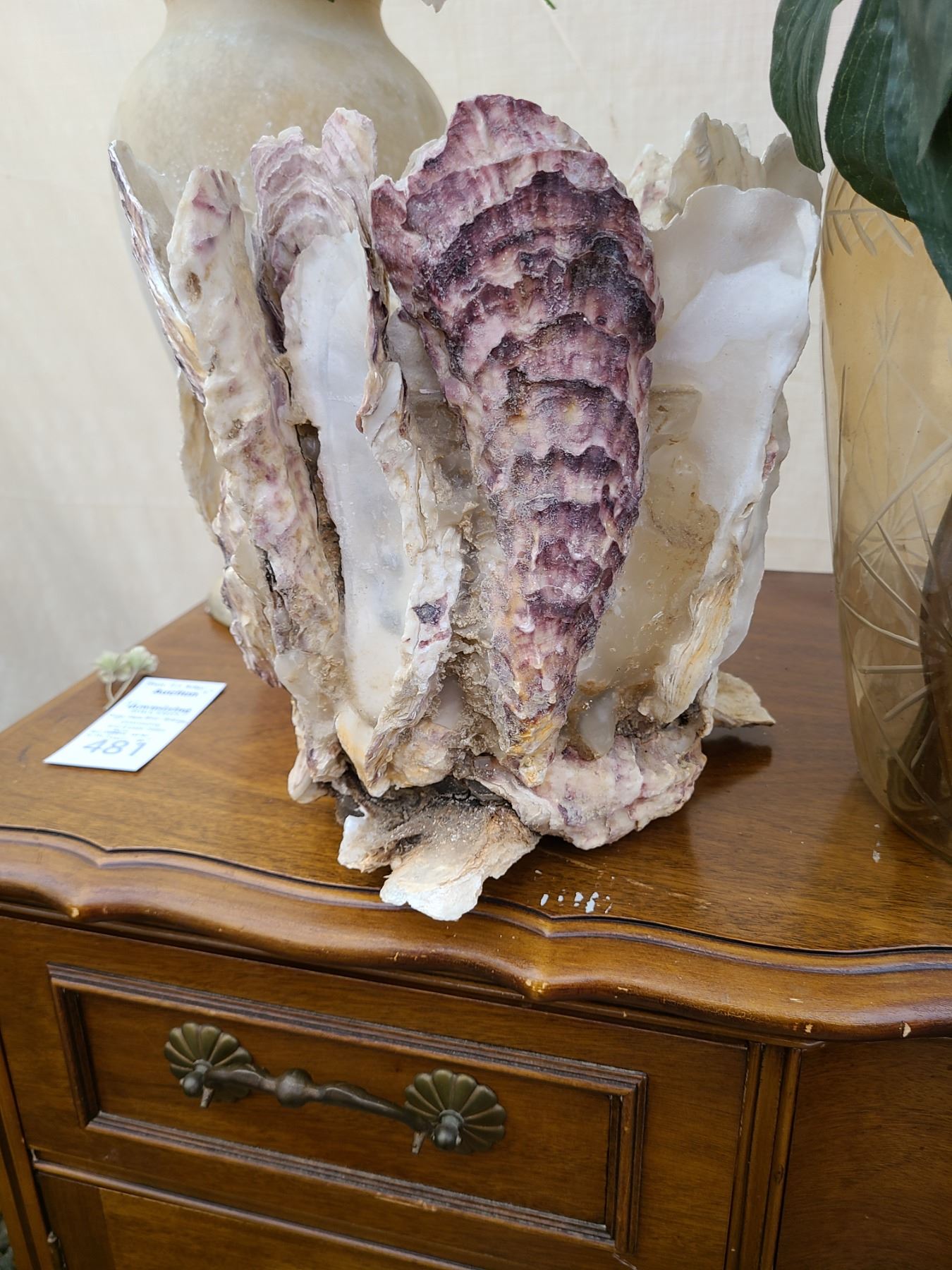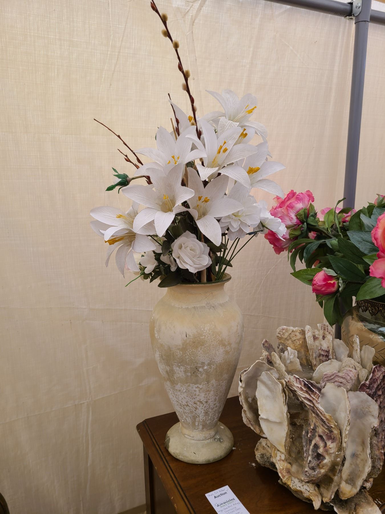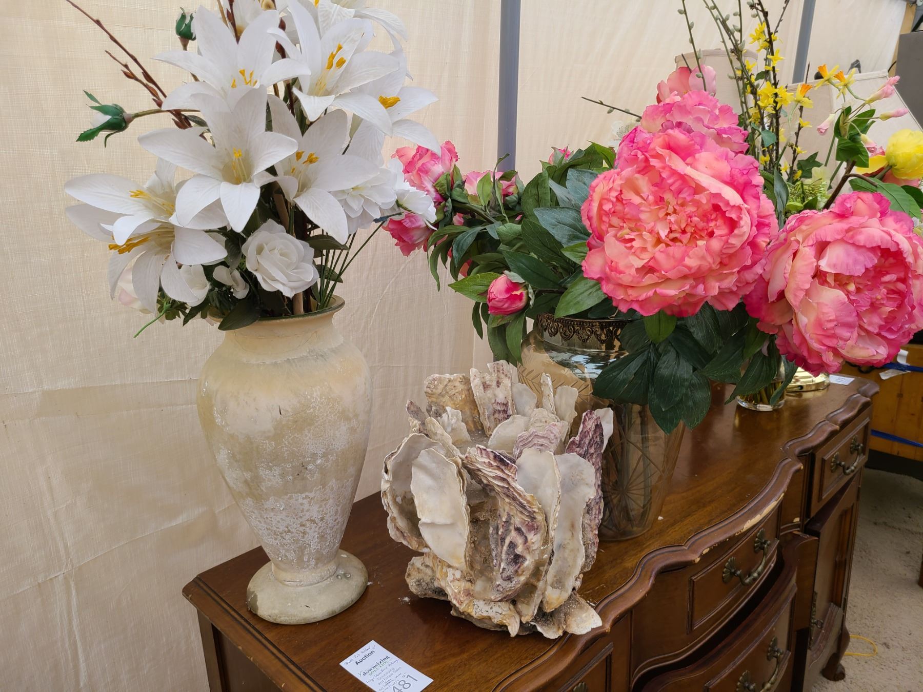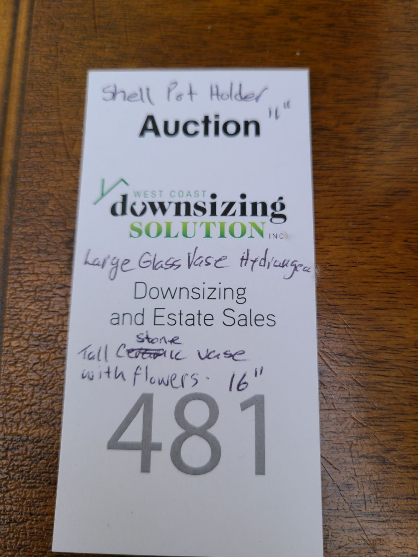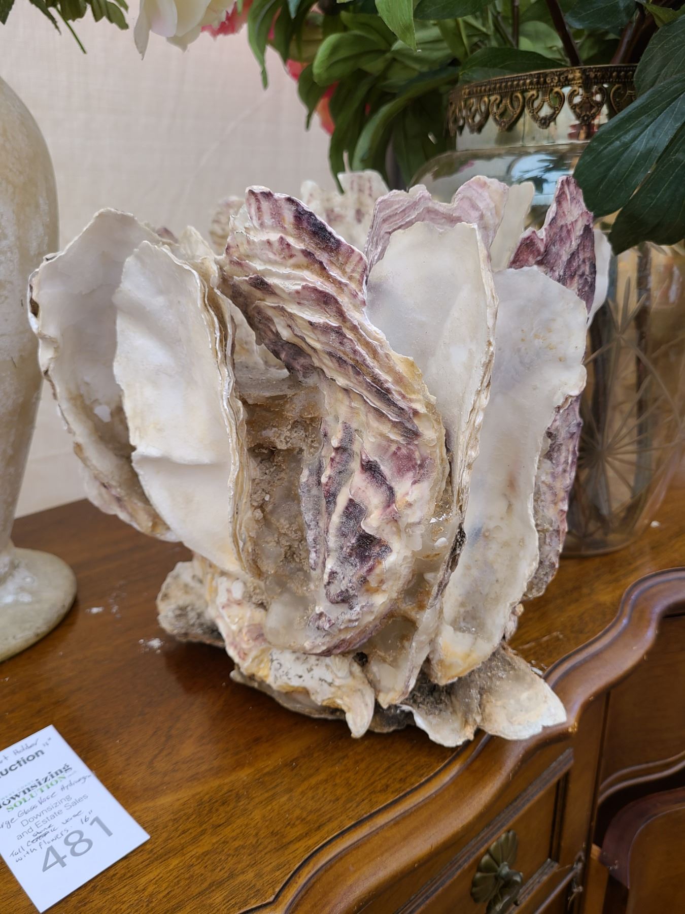 Shell plant holder 11”, Glass vase with hydrangeas 13”, sone vase with flowers 16”. Pickup at 9am