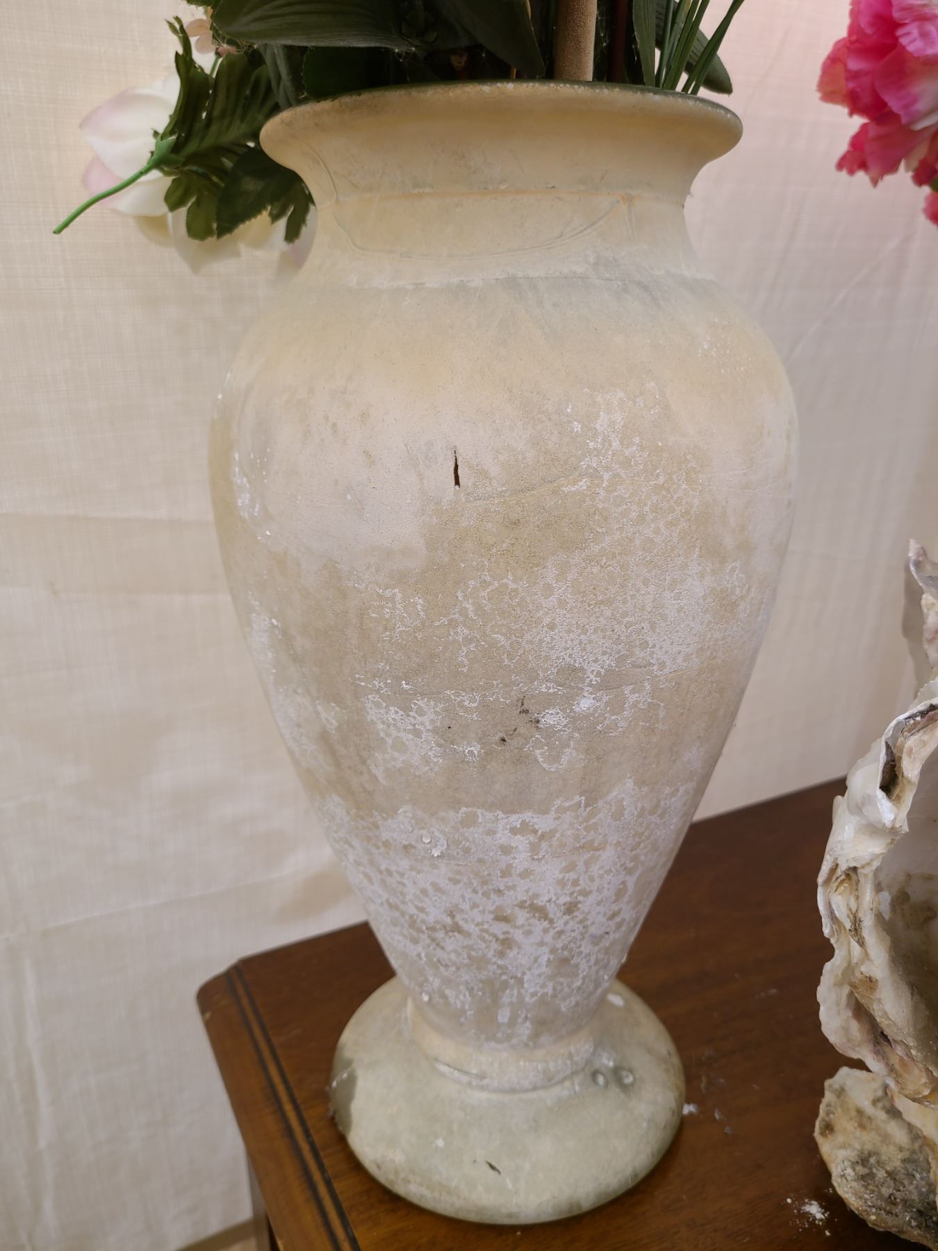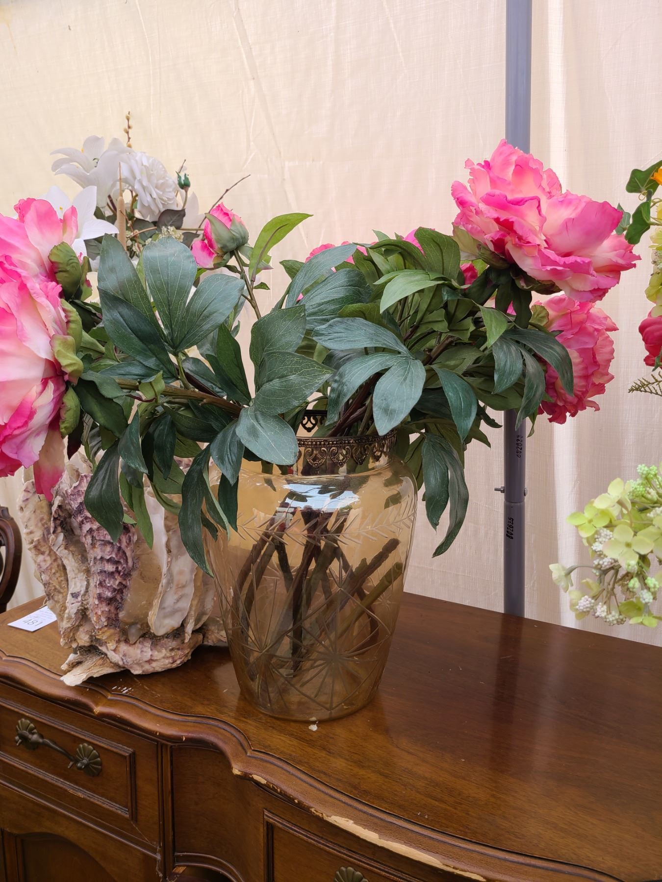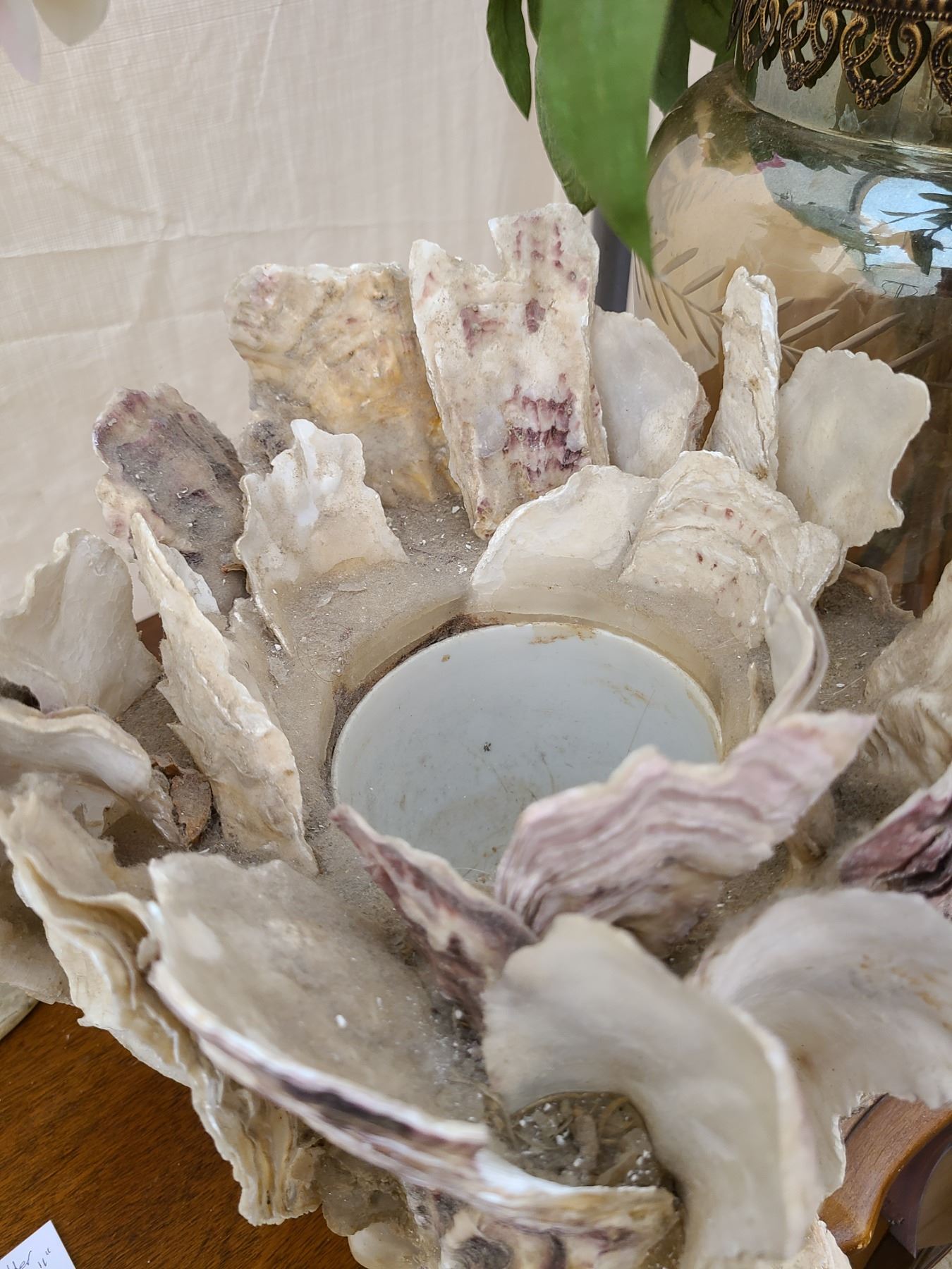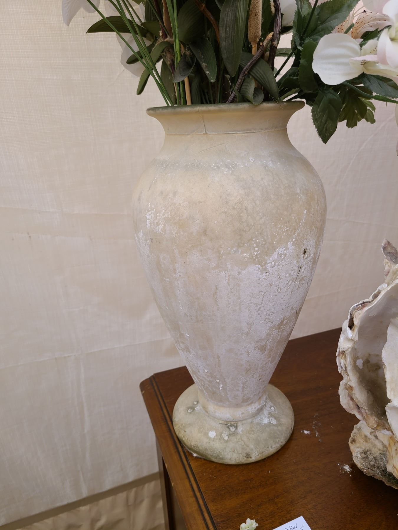 Shell plant holder 11”, Glass vase with hydrangeas 13”, sone vase with flowers 16”. Pickup at 9am