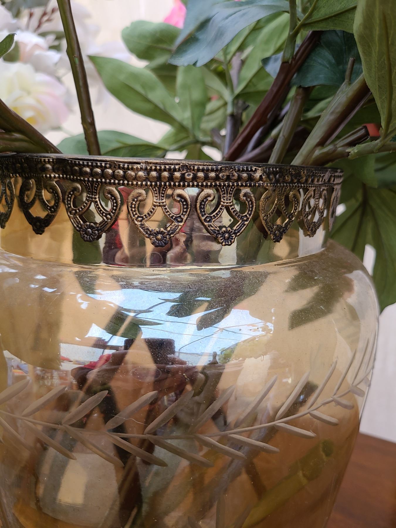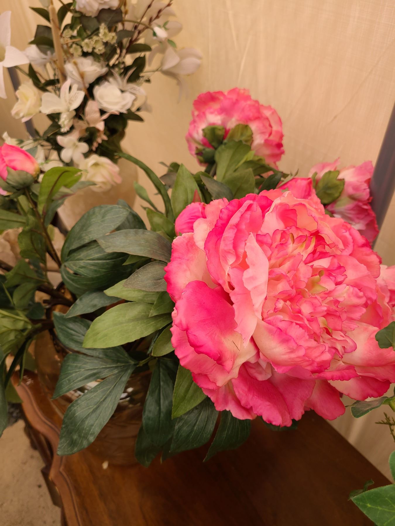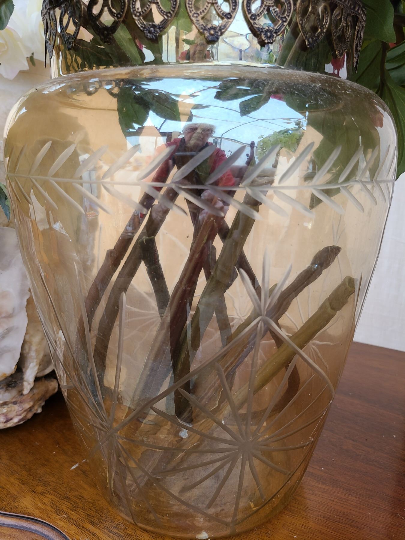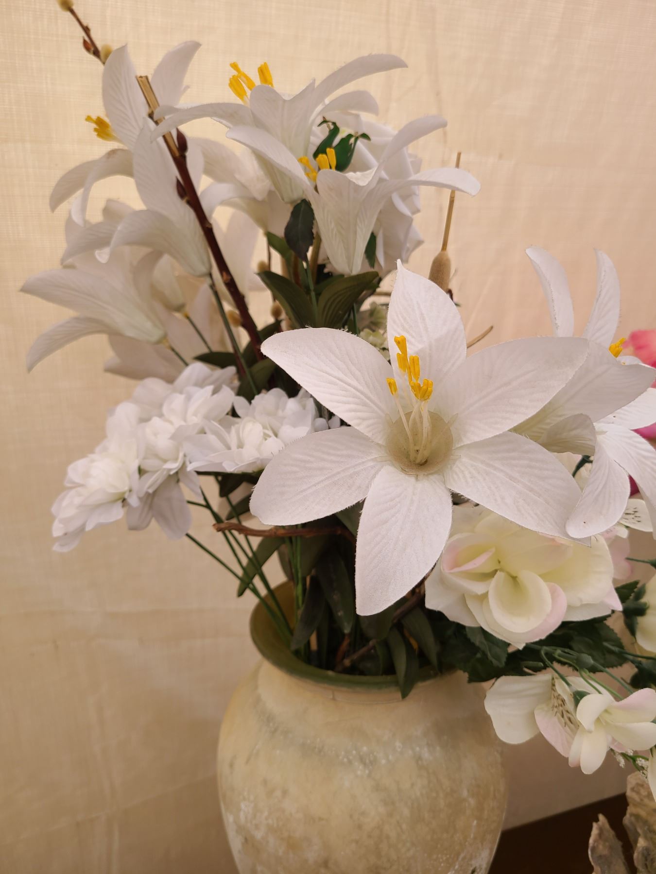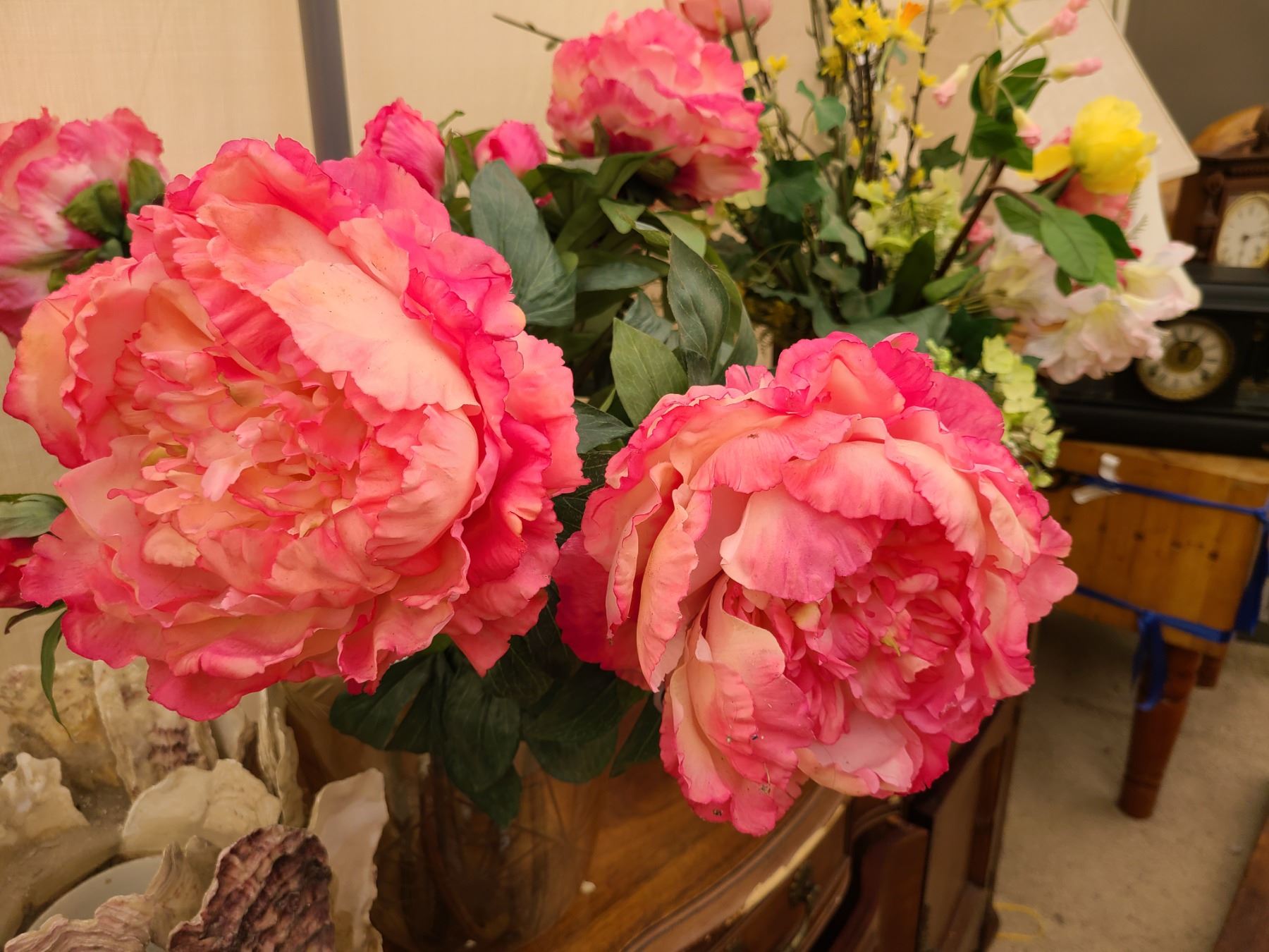 Shell plant holder 11”, Glass vase with hydrangeas 13”, sone vase with flowers 16”. Pickup at 9am