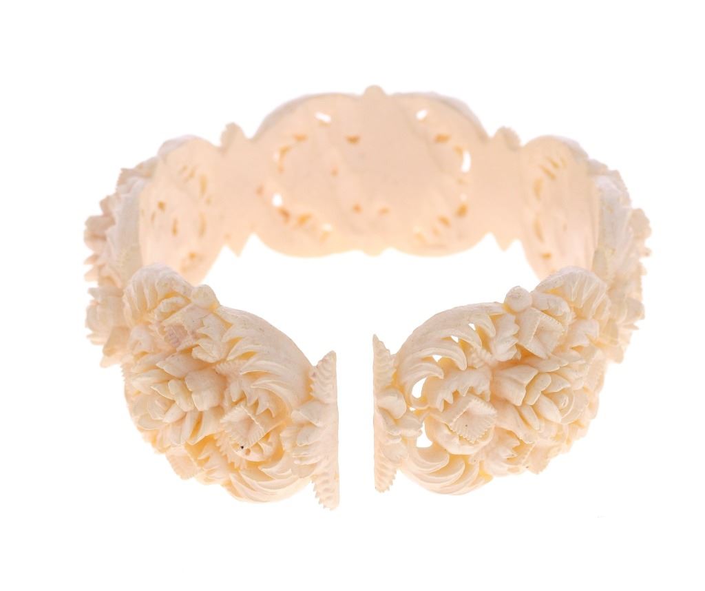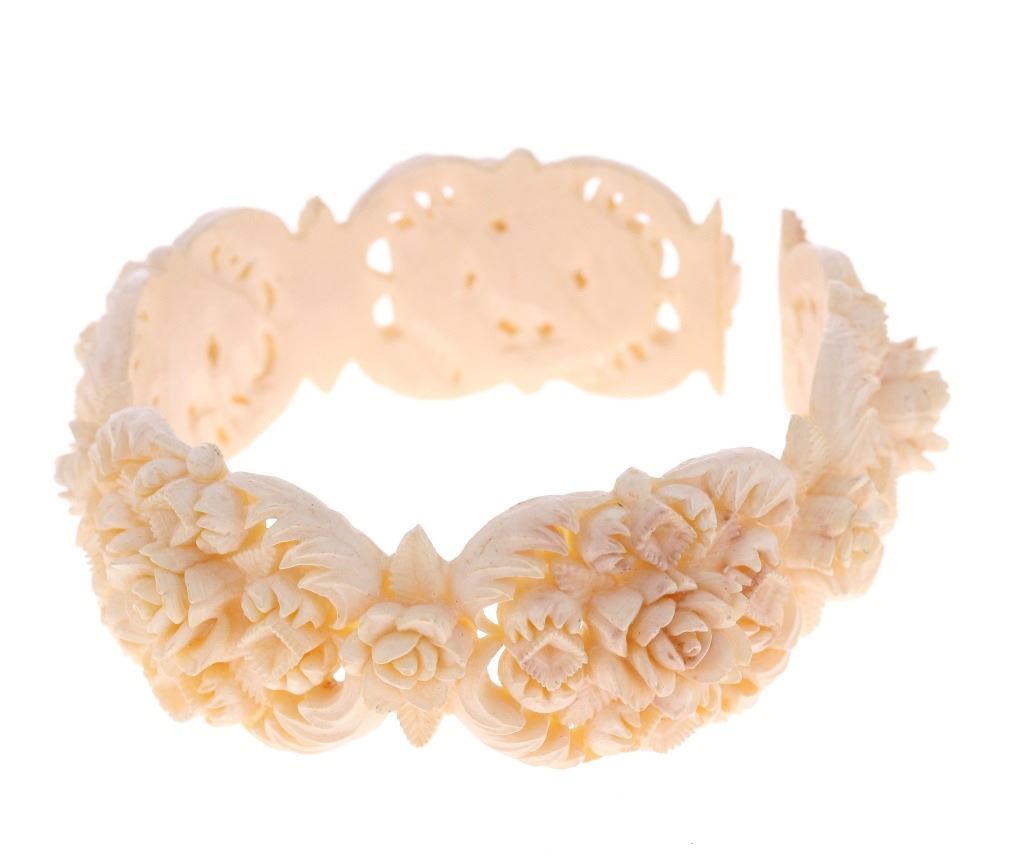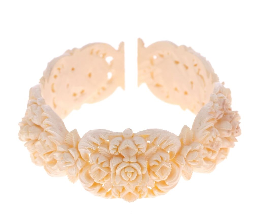 Featured in this lot is this floral hand carved vegetable ivory bracelet. This bracelet features a wonderfully and professionally crafted vegetable ivory construction shows a hand carved design of floral decoration. Vegetable ivory or tagua nut is a product made from the very hard white endosperm of the seeds of certain palm trees. Vegetable ivory is named for its resemblance to animal ivory. Species in the genus Phytelephas (literally "elephant plant"), native to South America, are the most important sources of vegetable ivory. The condition of this bracelet is good with no obvious signs of damage and in good overall condition. The overall measurements of this bracelet are 3 1/4" x 3" x 1 1/8" and shows a circumference of 6 3/4".