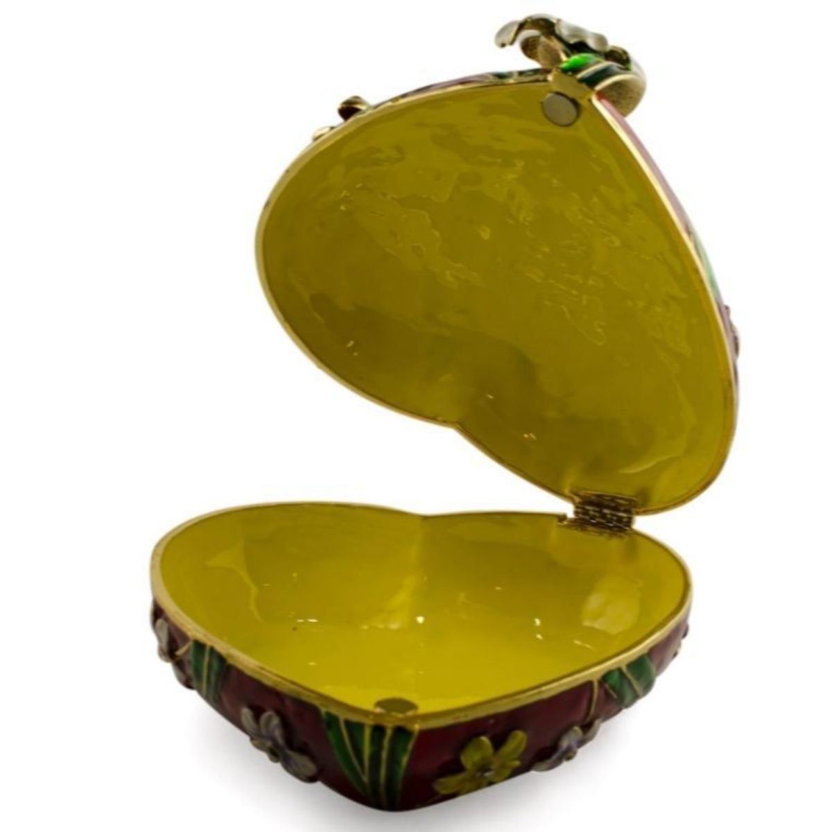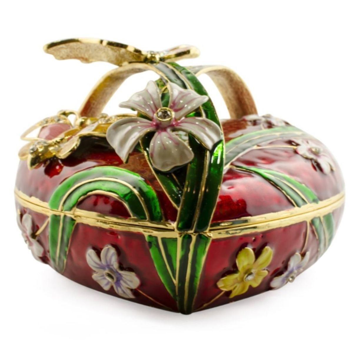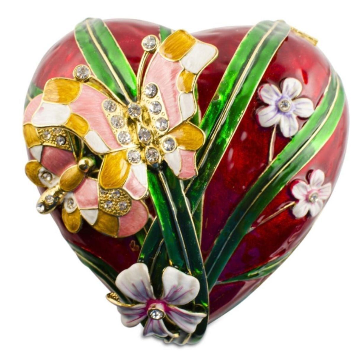 Butterfly & floral jewel trinket box. Hand-painted enamel over pewter with gold gilt, adorned with clear Austrian crystals. Opens on a hinge with magnetic closure 6.5"W X 5" H.