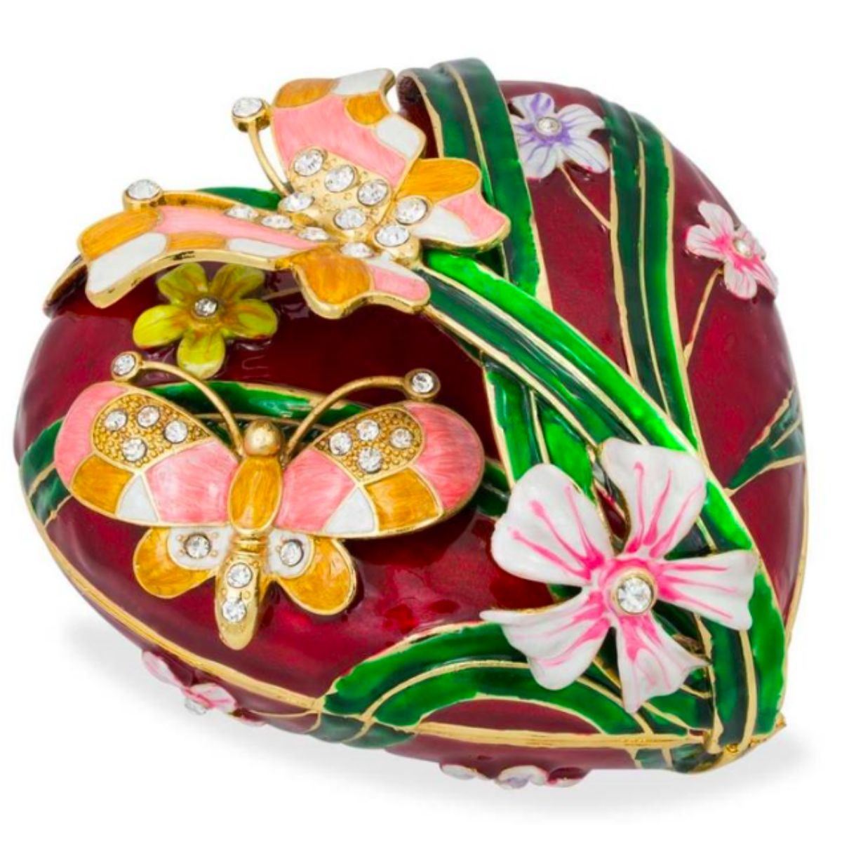 Butterfly & floral jewel, trinket box. Hand-painted enamel over pewter with gold gilt, adorned with clear Austrian crystals. Opens on a hinge with magnetic closure 6.5" W X 5" H.