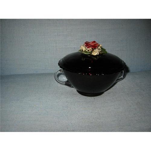 This magnificent 3.5 inch lidded ruby glass jar is decorated with porcelain colored flowers. 5 inch in diameter and 2 inch on the base. It has two attractive clear handles. This sugar jar is in very good condition with 2 minor invisible chips on the flowers. The glass is in excellent condition. it is beautiful!