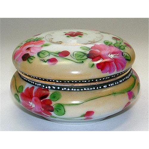 This lovely powder or trinket jar features central red flower encircled with in ornamental gold. Large cranberry red flowers, leaves and buds decorate the rest of the lid and the jar. The bottom of the lid and top of the jar are further adorned each with a frieze of small, white Moriage beads against a thin black band. Measuring 2 1/4 inches tall x 3 1/2 inches across the middle - with both the lid and jar in excellent condition - neither is marked.