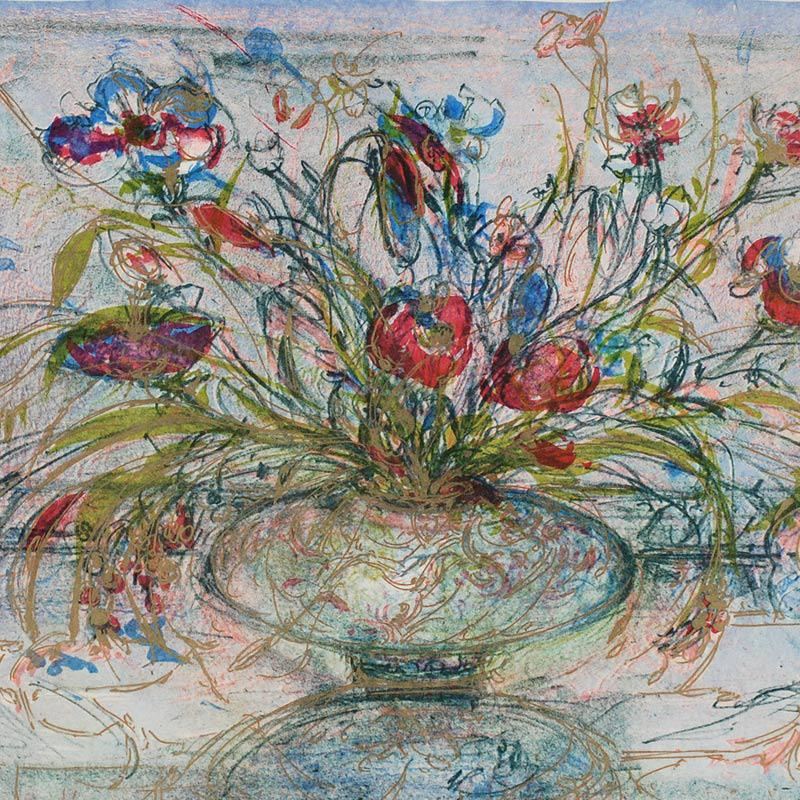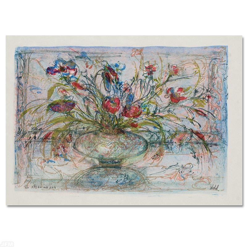 Wild lines and muted colors make Edna Hibel's art stand out in any room. "Floral Mystic" is a limited edition lithograph on paper, numbered and hand signed by Hibel. Includes Certificate of Authenticity! Measures approx. 20" x 15" (with border), 16.5" x 11.5" (image).