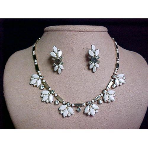 This vintage floral necklace is gold plated with white stones and rhinestones linked together creating an 18" adjustable choker. The matching clip-on earrings repeat the same motif. This set is truly and unsigned beauty.