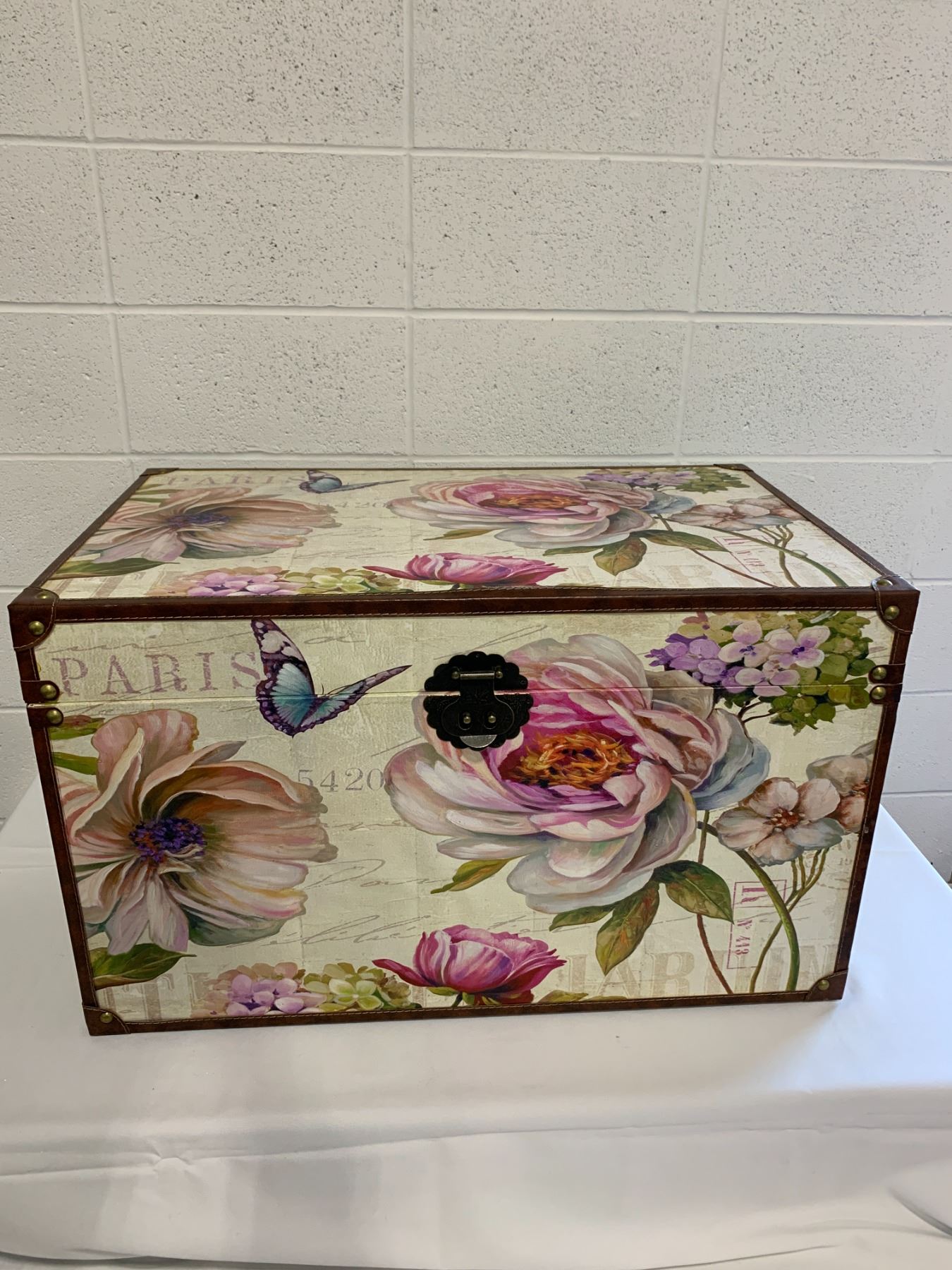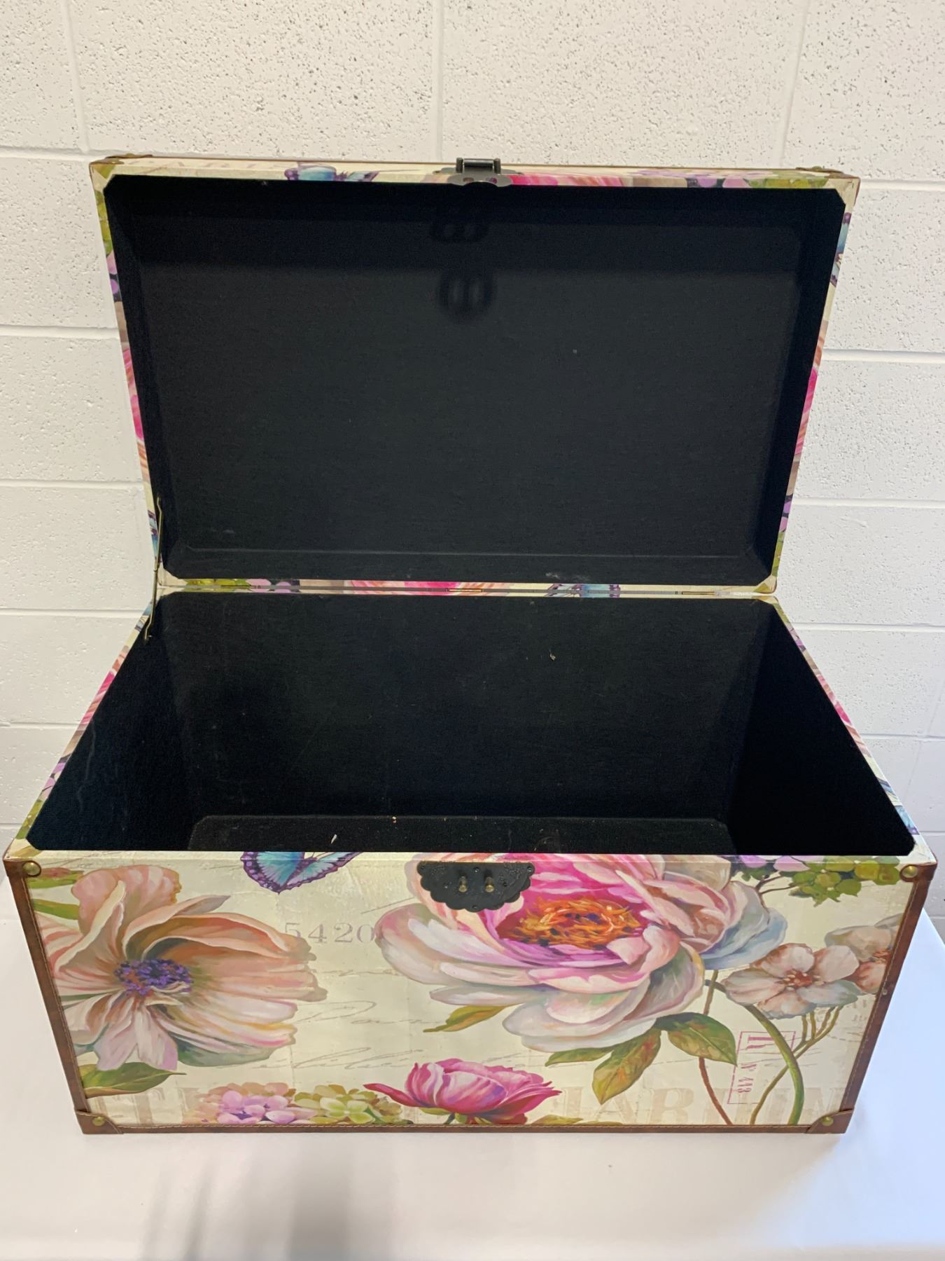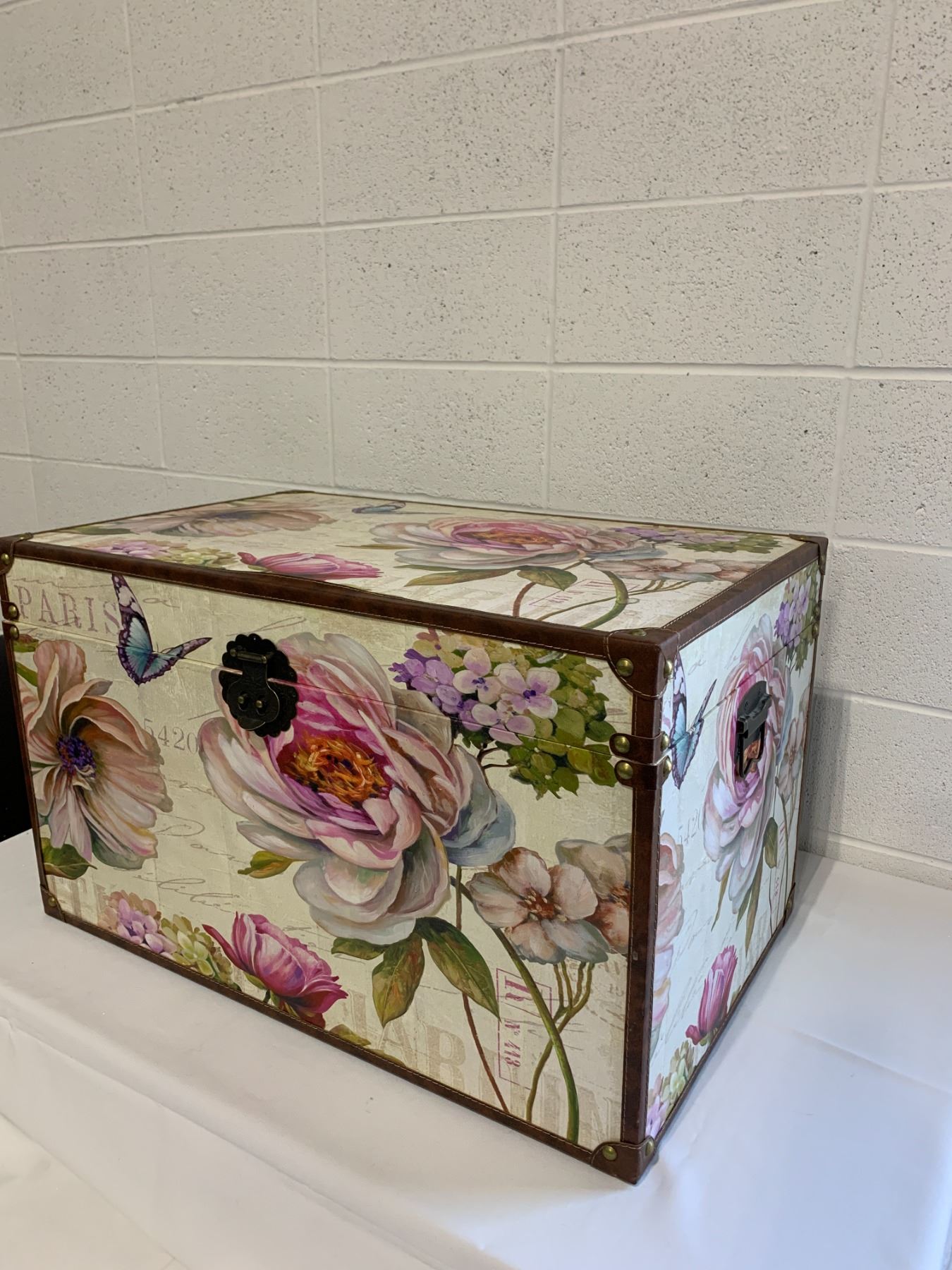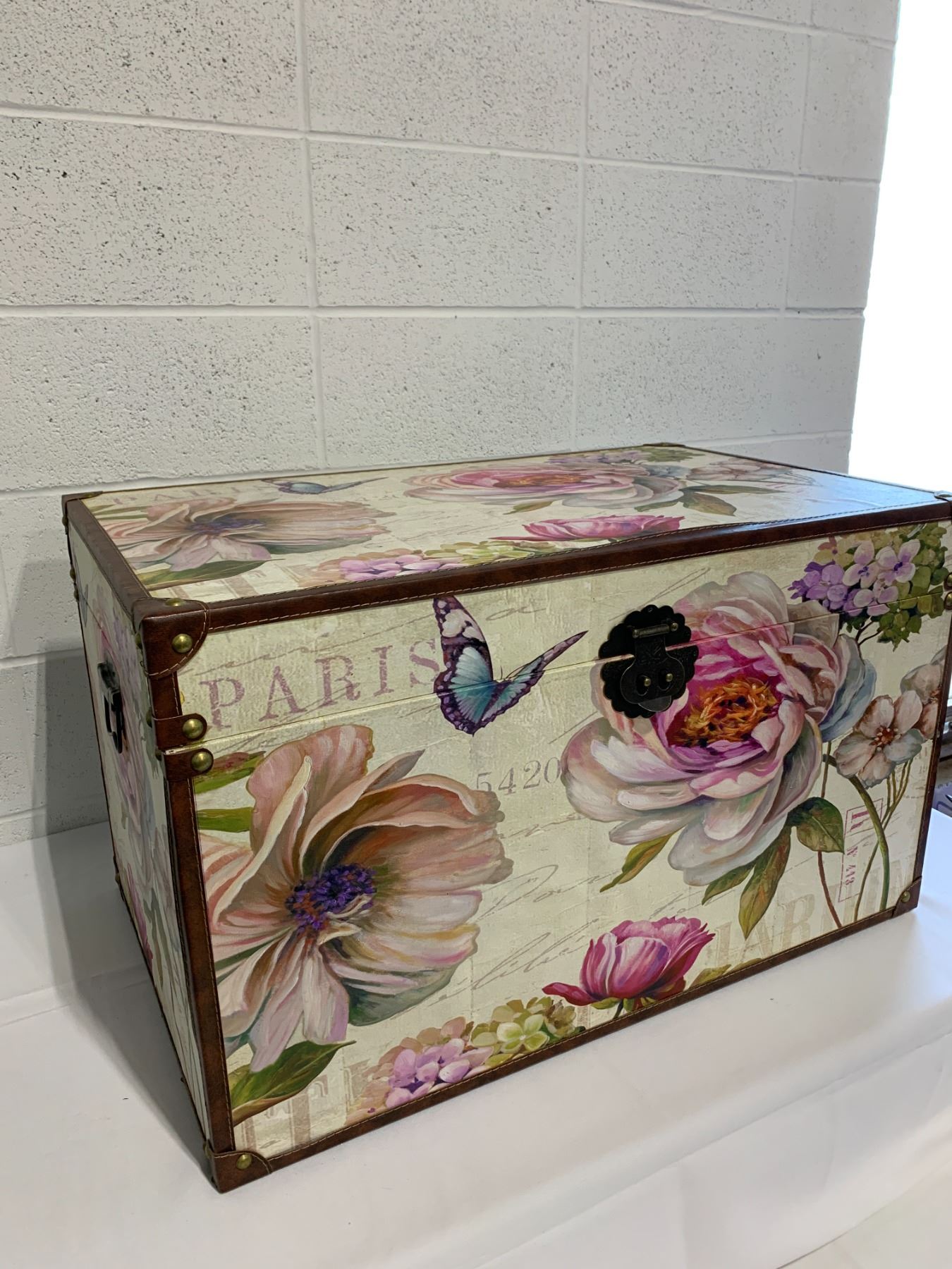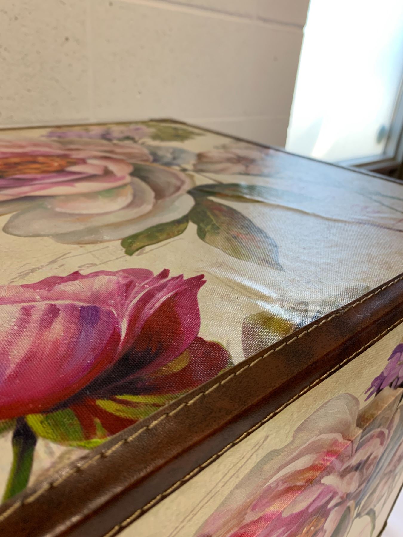31in long x 19in wide x 18in high/ leather trim is lifting in some areas