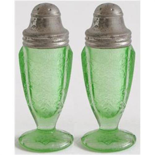 Jeannette Glass 'Floral' (Poinsettia) Depression Green Footed Salt & Pepper Set - Here is a hard to find authentic Jeannette Glass 'Floral' (aka Poinsettia) Depression Green Footed Salt & Pepper Set in very good condition. Each piece stands 4 inches tall and has it's original top. The glass is in excellent condition, while the metal of the tops is only slightly worn. Floral was produced from 1931-1935