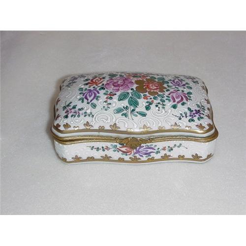 Porcelain Covered box 5 1/4" long x 3 3/4' wide 2 1/4" tall. Probably Japanese, Serpentine shape with domed lid hand painted flowers and raised enamel decorations. Gilt brass metalwork.