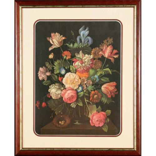 This is a print that is in very good condition and shows in crisp clarity the many details that the original artist so meticulously rendered. Exquisite and packed with rich complimentary colors that jump out from the dark background. This print is perfectly framed in a brown frame that is trimmed with gold and compliments the many hues throughout the picture. The bright colors seem to jump out of this 22? x 18? picture. This is an outstanding print for a great price.