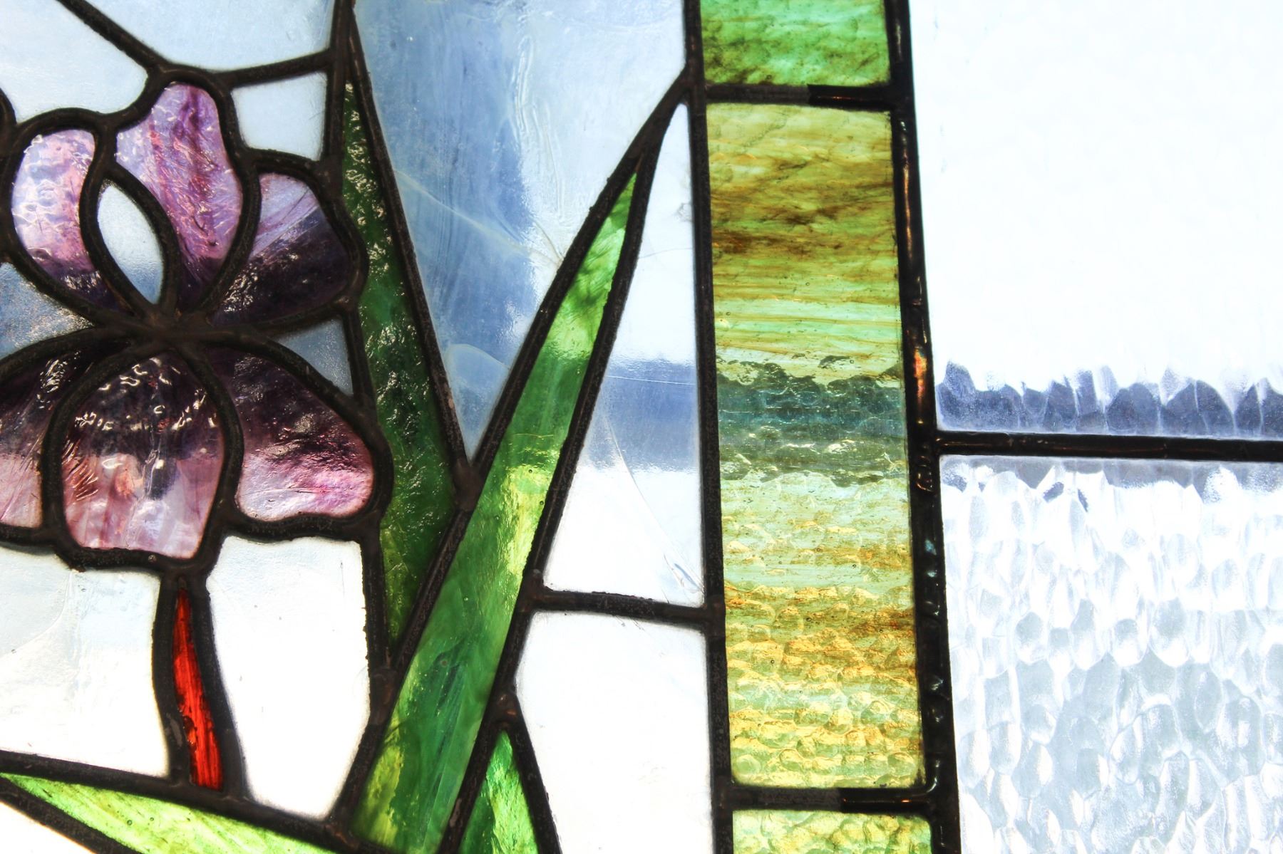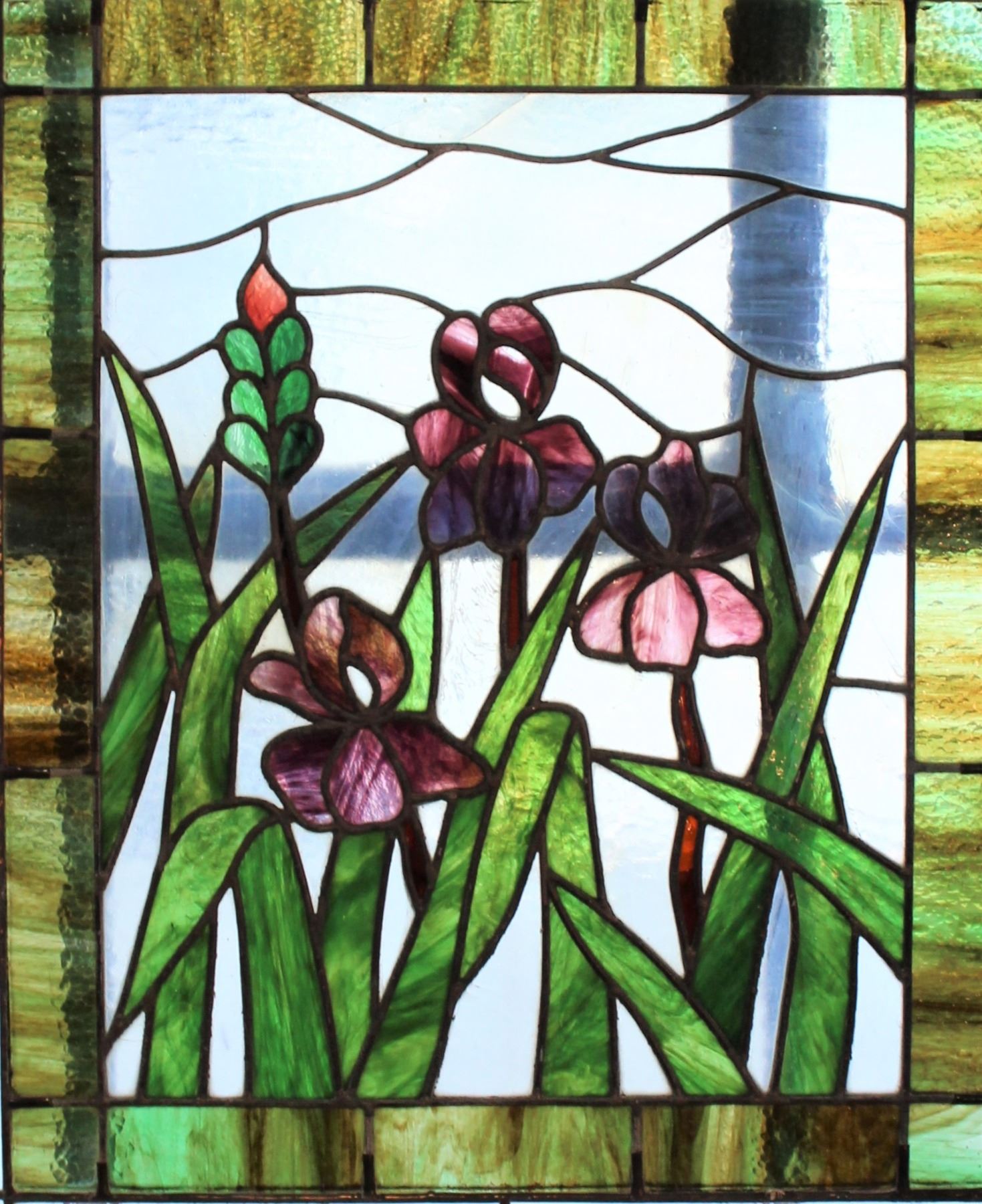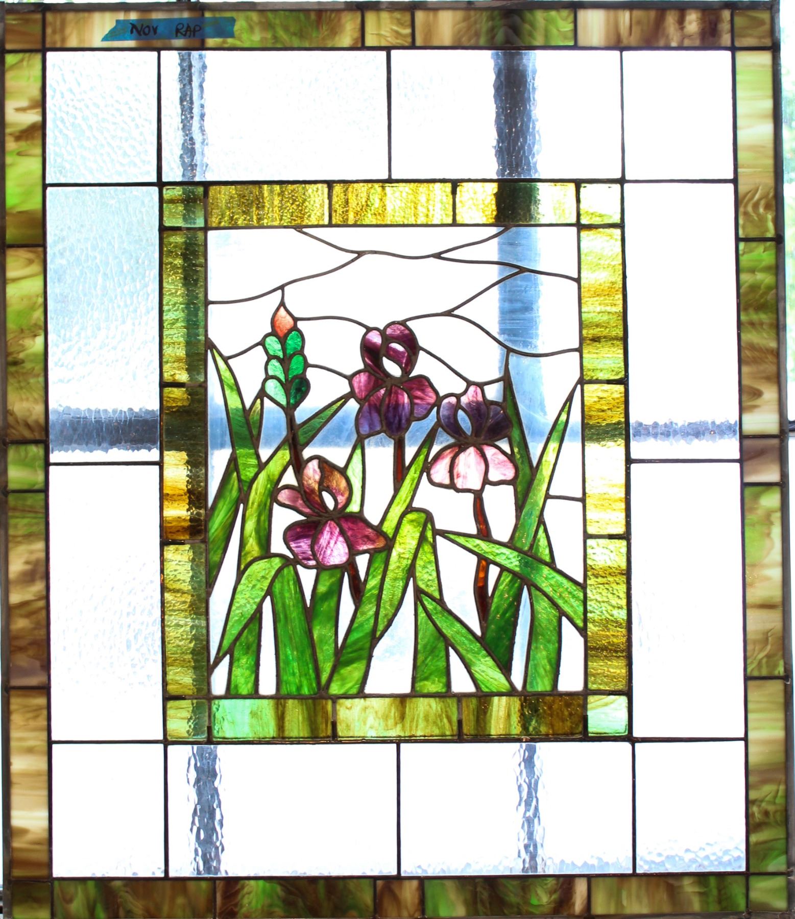 Flower glass art panel, purple irises in central panel, surrounded by green milk glass border followed by textured or pebbled clear glass and another green milk glass border.