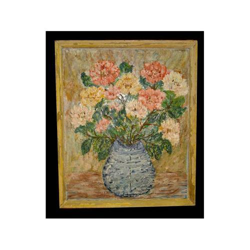 Floral Still Life Oil Painting, oil on massonite, Impressionist monogrammed S P lower left. SIZE: 14 x 16 inches (artwork), 15 x 17 inches (frame). CONDITION: some wear to frame, overall very good.