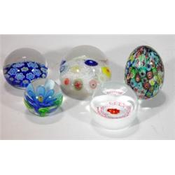 Floral Strathern paperweight, Caithness miniature rose paperweight and three others, largest 7cm diameter