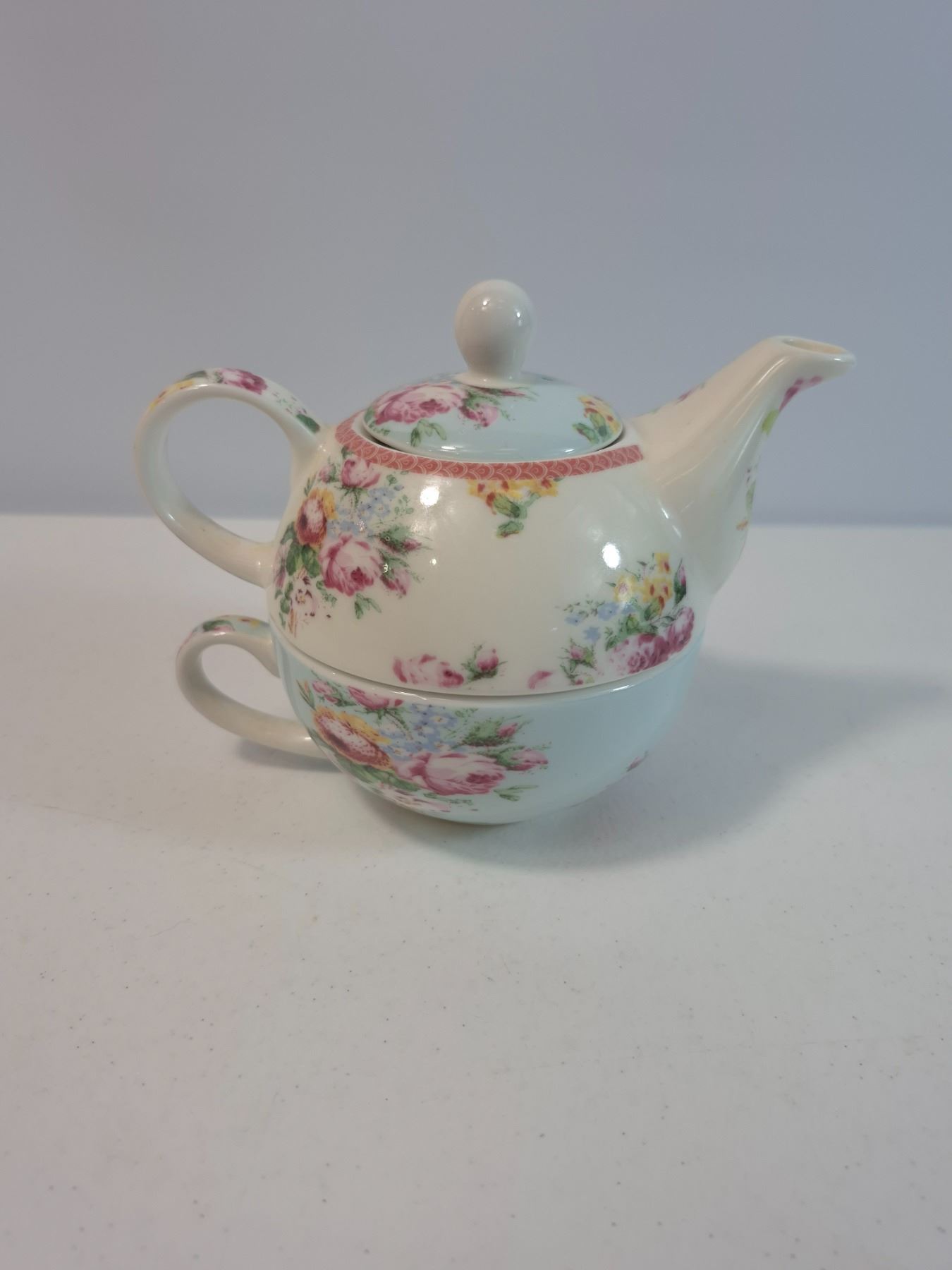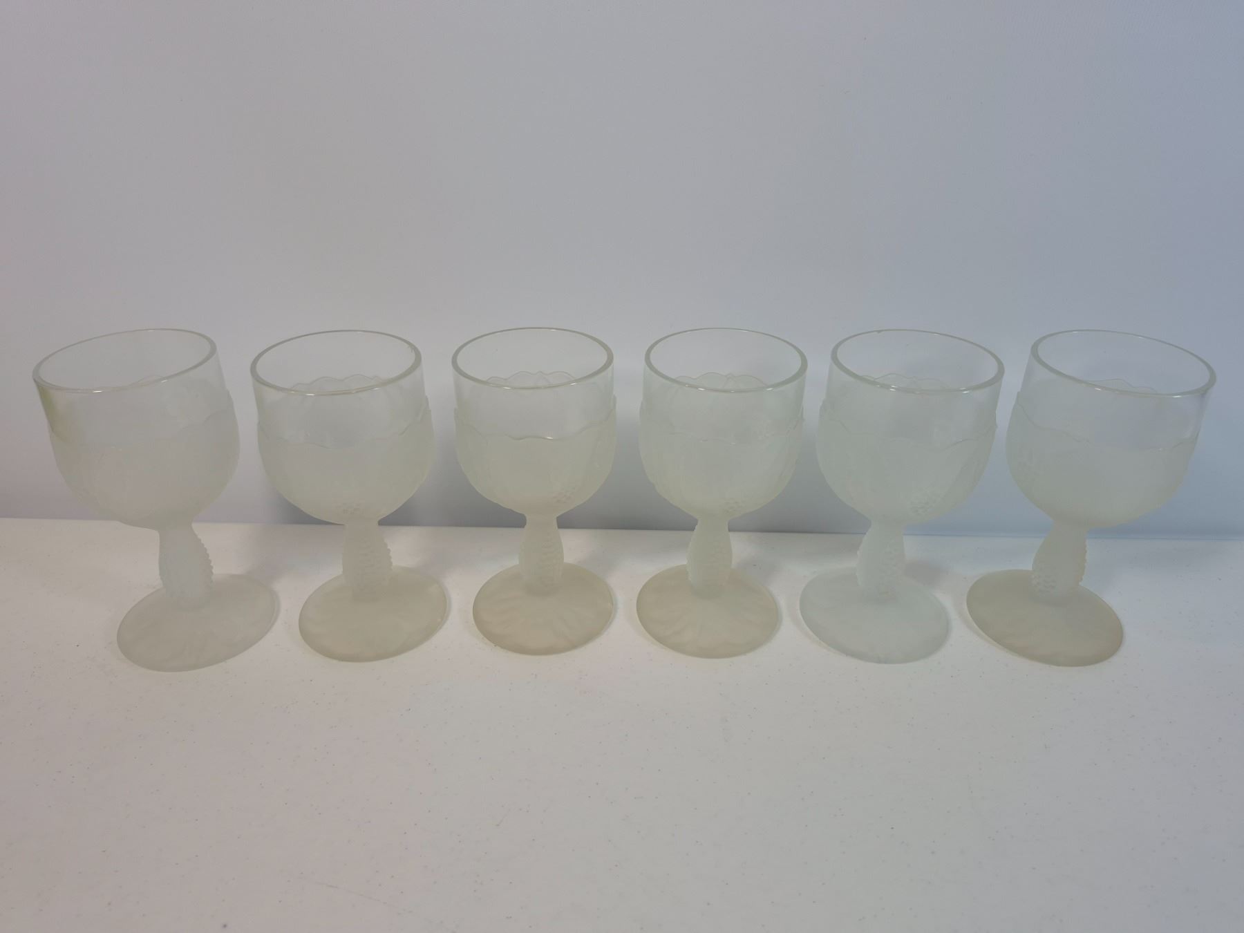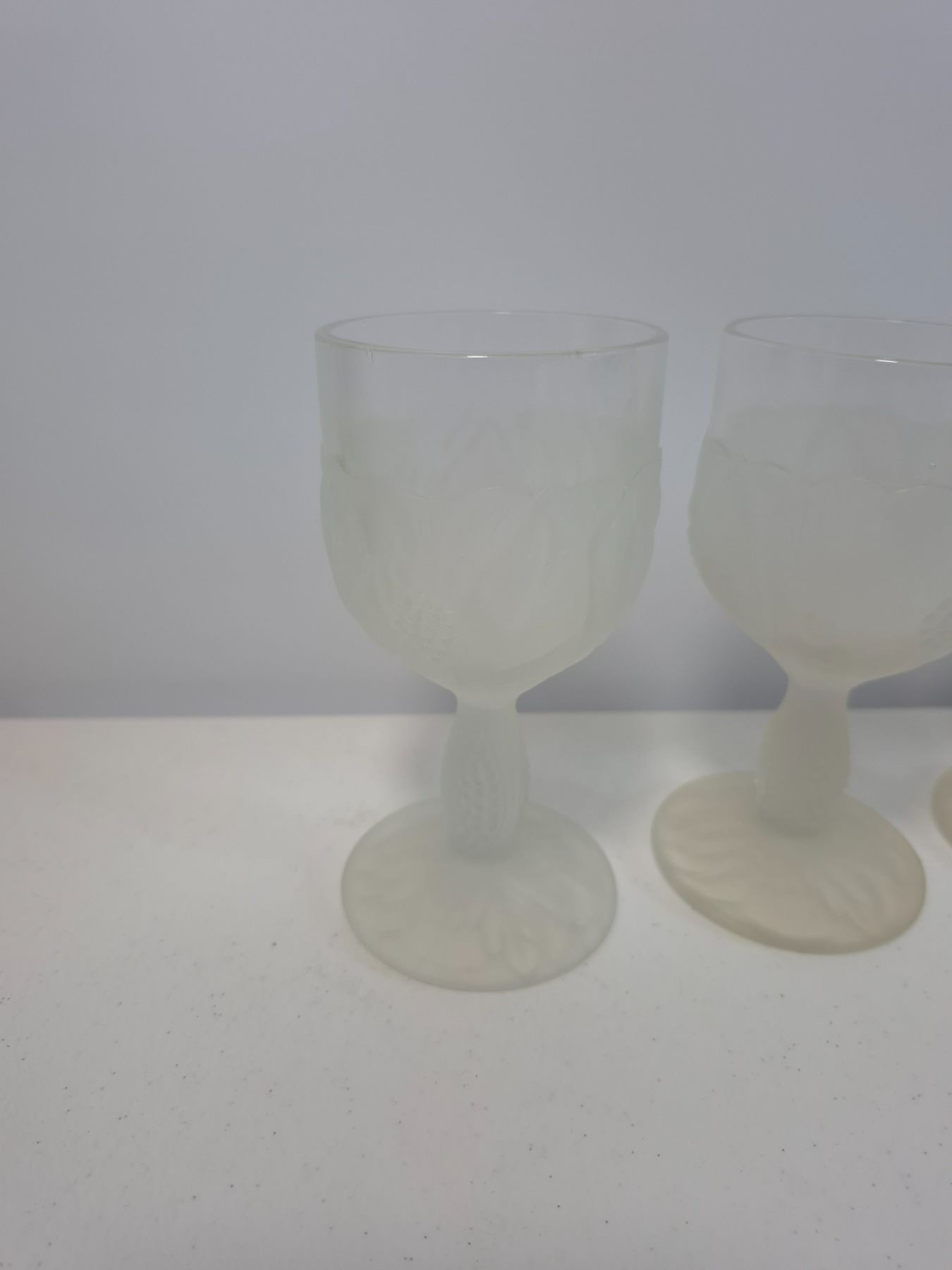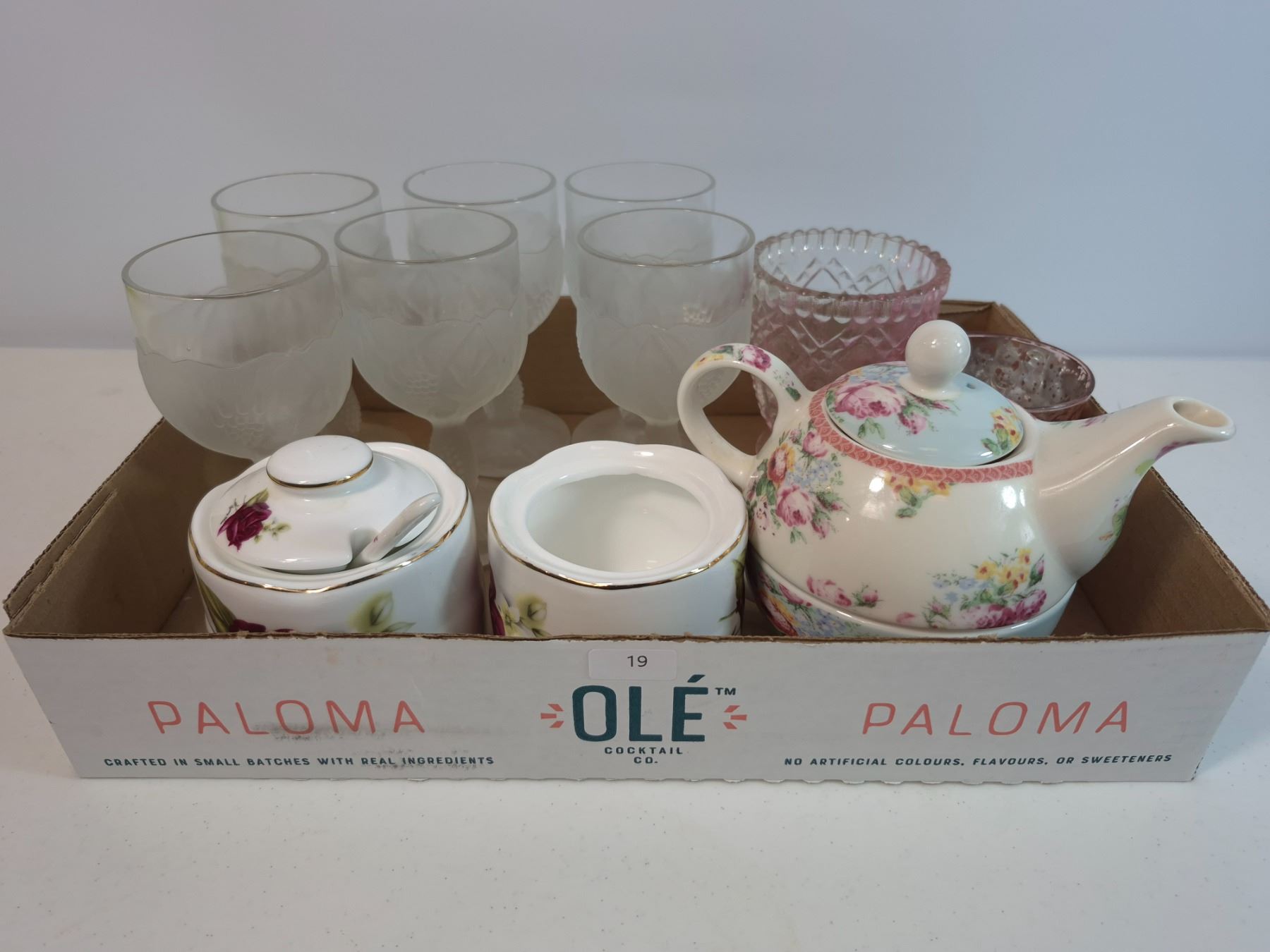 Charming floral porcelain teapot with matching sugar and creamer, paired with frosted and pink pressed glass goblets and bowls. A sweet mixed vintage lot in good condition, light age wear.