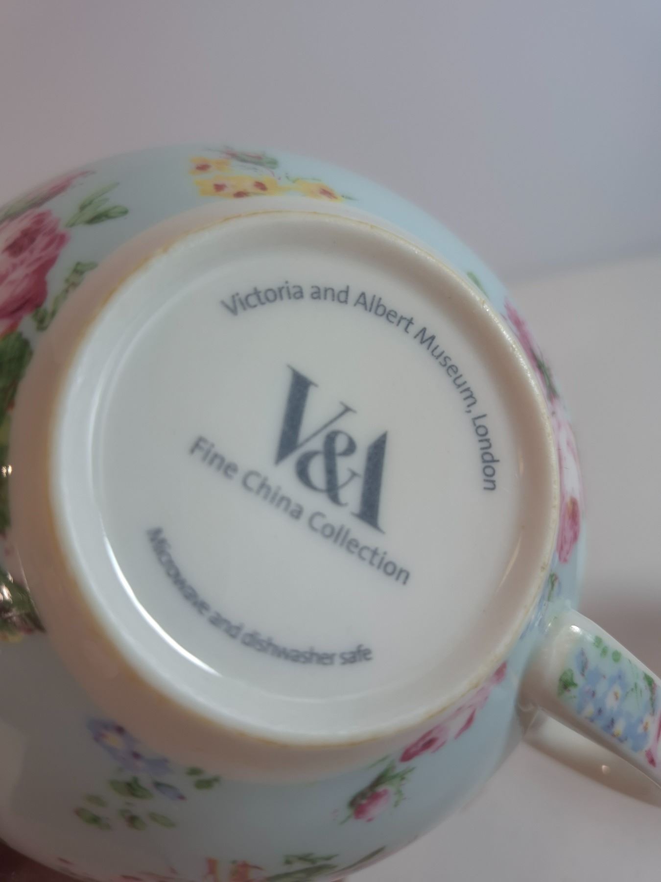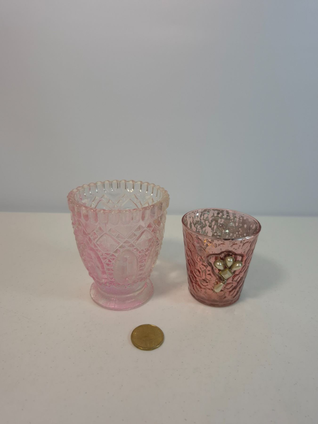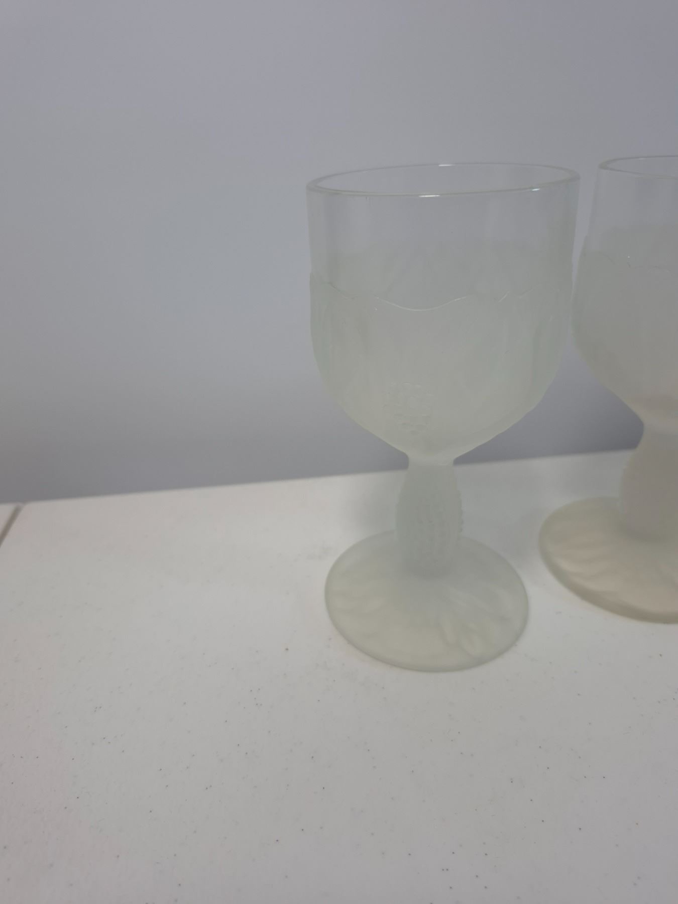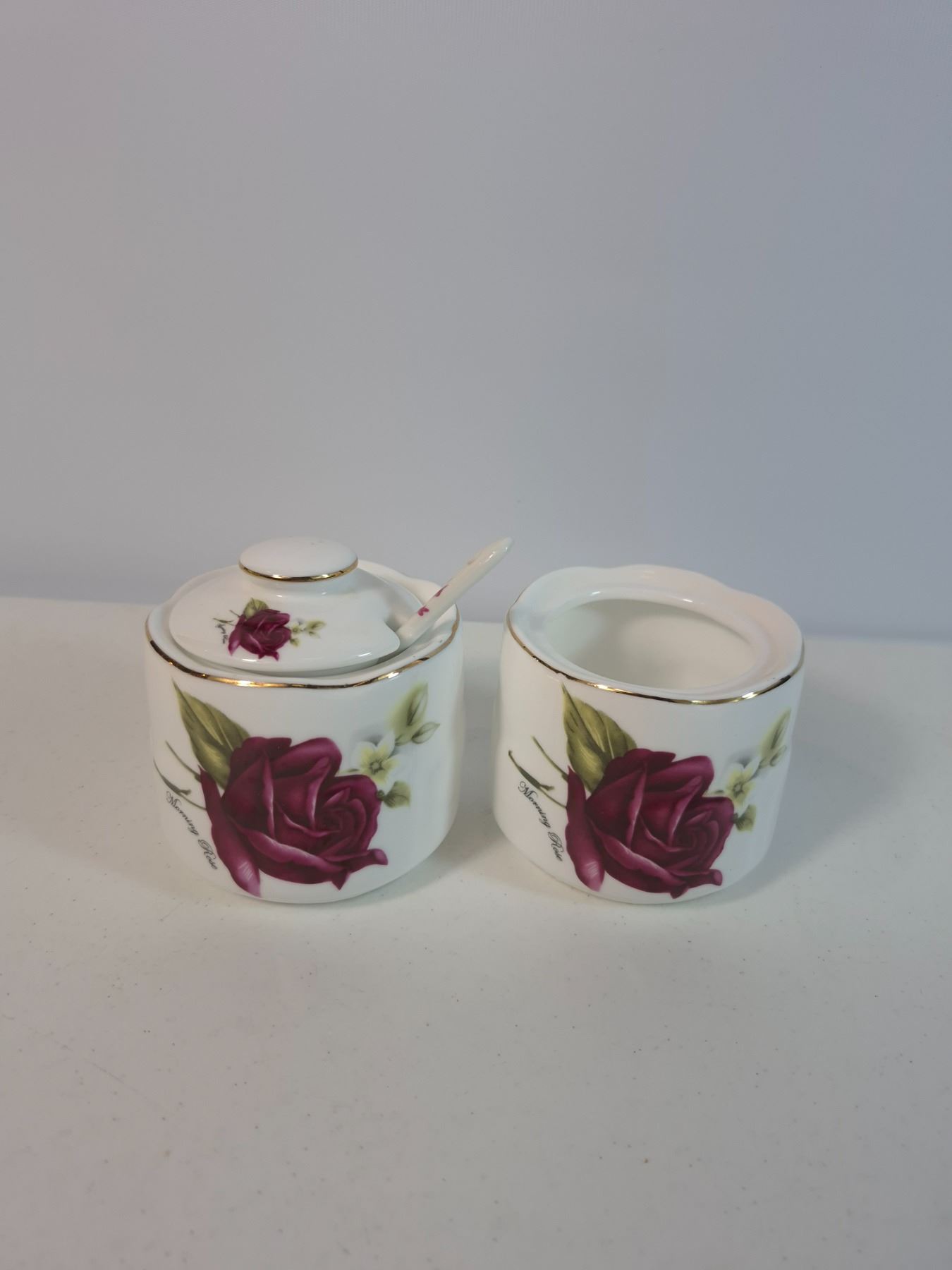 Charming floral porcelain teapot with matching sugar and creamer, paired with frosted and pink pressed glass goblets and bowls. A sweet mixed vintage lot in good condition, light age wear.