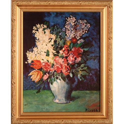 This print is of a beautiful arrangement of vivid flowers by the timeless and creatively brilliant Picasso. The short brushstrokes create intricately defined flower petals and leaves, enhancing Picasso?s already brilliant command and creation of light and shadow. The closely centered floral array, brightly painted to contrast interestingly with the rich blue background, is impressive in its palette and variety. A sense of depth is furthered by the clarity in brushstrokes and the close perspective from the viewer. This print is vibrant and clearly shows the Impressionist side of Picasso which he is not typically known for, making this piece ...