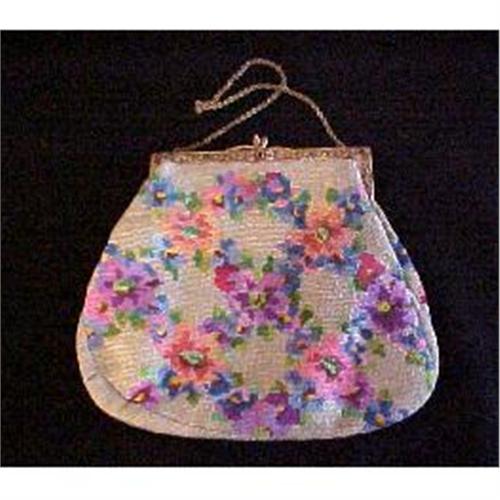Hand sticthed wool tapestry floral bag with silk and flower edged lining. Two head snake purse clasp with set diamond paste and chain handle. Good for Day or evening.