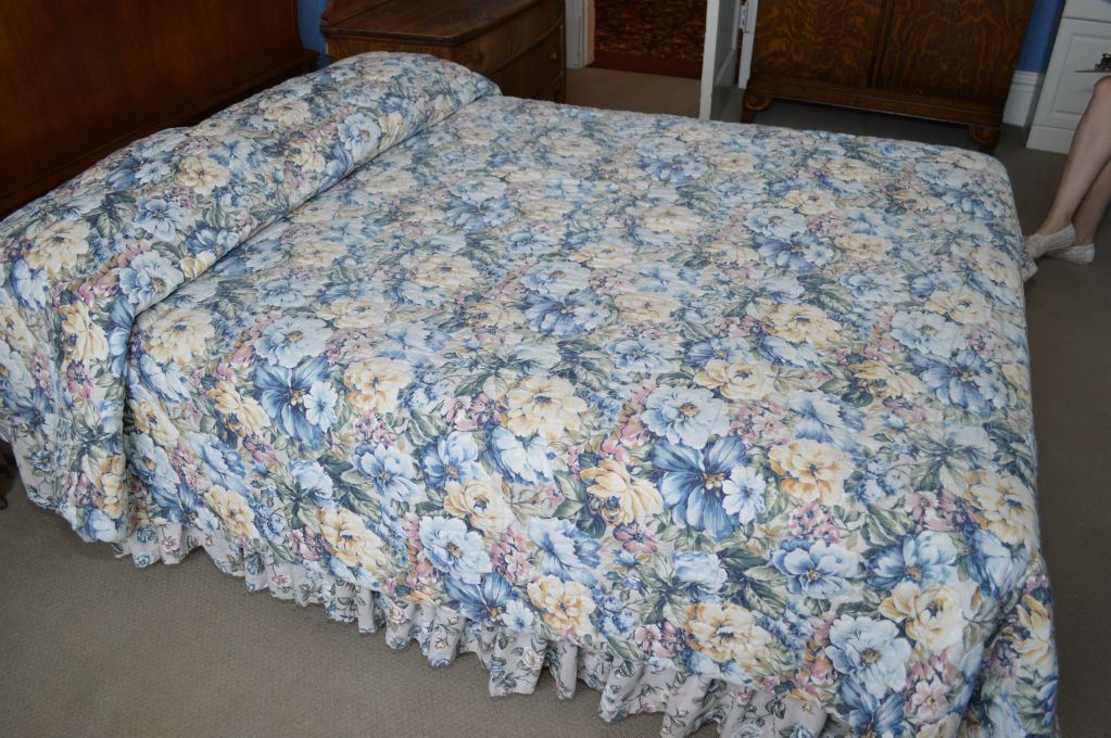 Floral bed linens in blue, greens and yellows, double size. with brown curtain