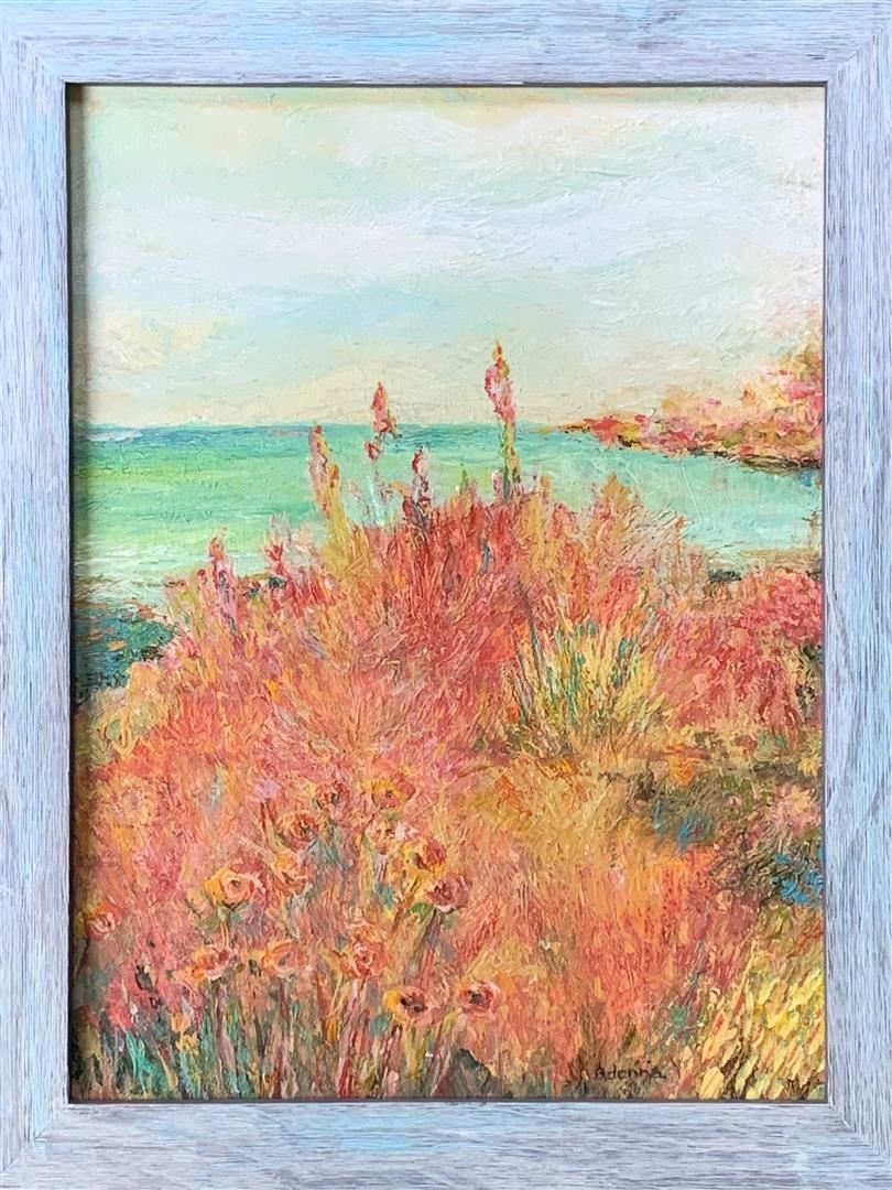 Acrylic on panel board by Adonna. A gorgeous floral spray in a shabby chic coastal frame. 14.5 x 18.5 finished size.