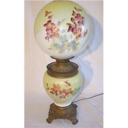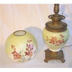 Floral decorated electrified Gone with the Wind table lamp with ornate brass mounted base and violet, blue, & orange flower decoration on white & yellow background. Small chip in bottom rim of shade. 23 1/2" tall. 9 1/2" tall shade.