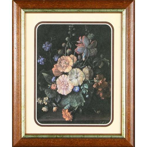 This is a lovely print of a bunch of colorful flowers against a black backdrop. The print is in very good condition and shows in crisp clarity the many details that the original artist so meticulously rendered. This print is perfectly framed in a gold and brown wood frame that compliments the picture perfectly. This print measures a total of 12? x 10? framed.