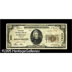 <B>Florence, AL</B></I> - $20 1929 Ty. 1 <B>The First NB </B></I> Ch. # 3981<BR>A nice <B>Very Fine</B></I> with considerable paper body remaining. Another opportunity to acquire a note from this strongly collected locale. Lot:16808
