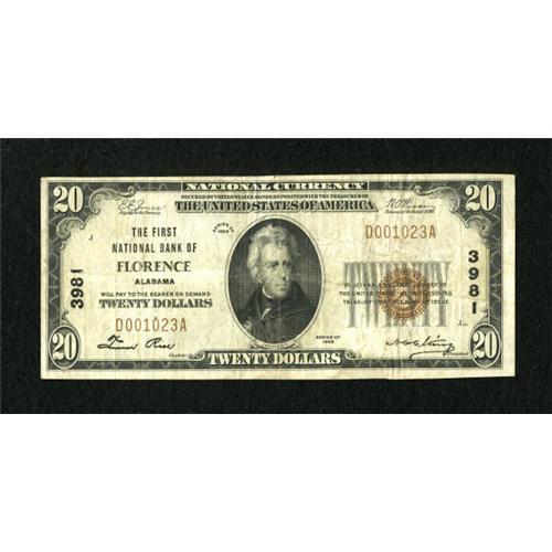 <B>Florence, AL</B></I> - $20 1929 Ty. 1 <B>The First NB</B></I> Ch. # 3981<BR> The paper remains bright on this original issue. <B>Fine-Very Fine.</B></I><BR><I>From The Kansas City Collection</B></I><BR><BR><b>Shipping:</b> Coins & Currency (<a target="_blank" href="http://www.heritageauctions.com/common/shipping.php">view shipping information</a>)