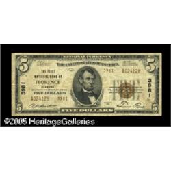 <B>Florence, AL</B></I> - $5 1929 Ty. 2 <B>The First NB </B></I> Ch. # 3981<BR>A nicely centered <B>Fine-Very Fine</B></I> free from any problems or distractions of any kind. Although notes from this community are hardly scarce, this is a strongly collected part of the state. We expect this example will likely fetch in the range of... Lot:16806