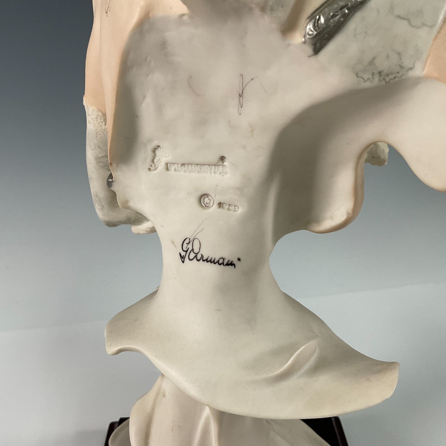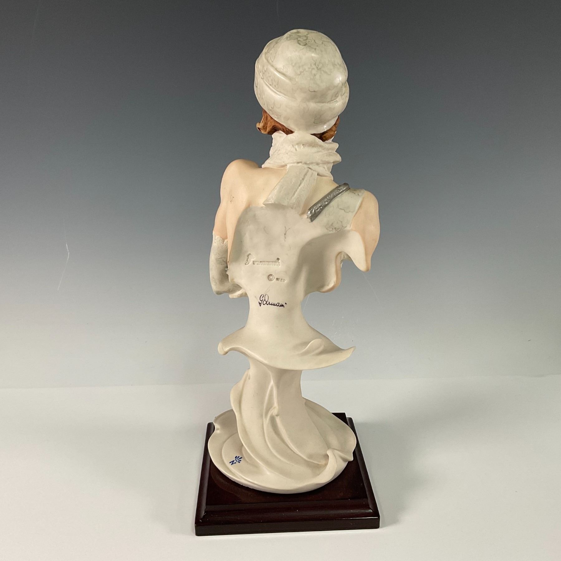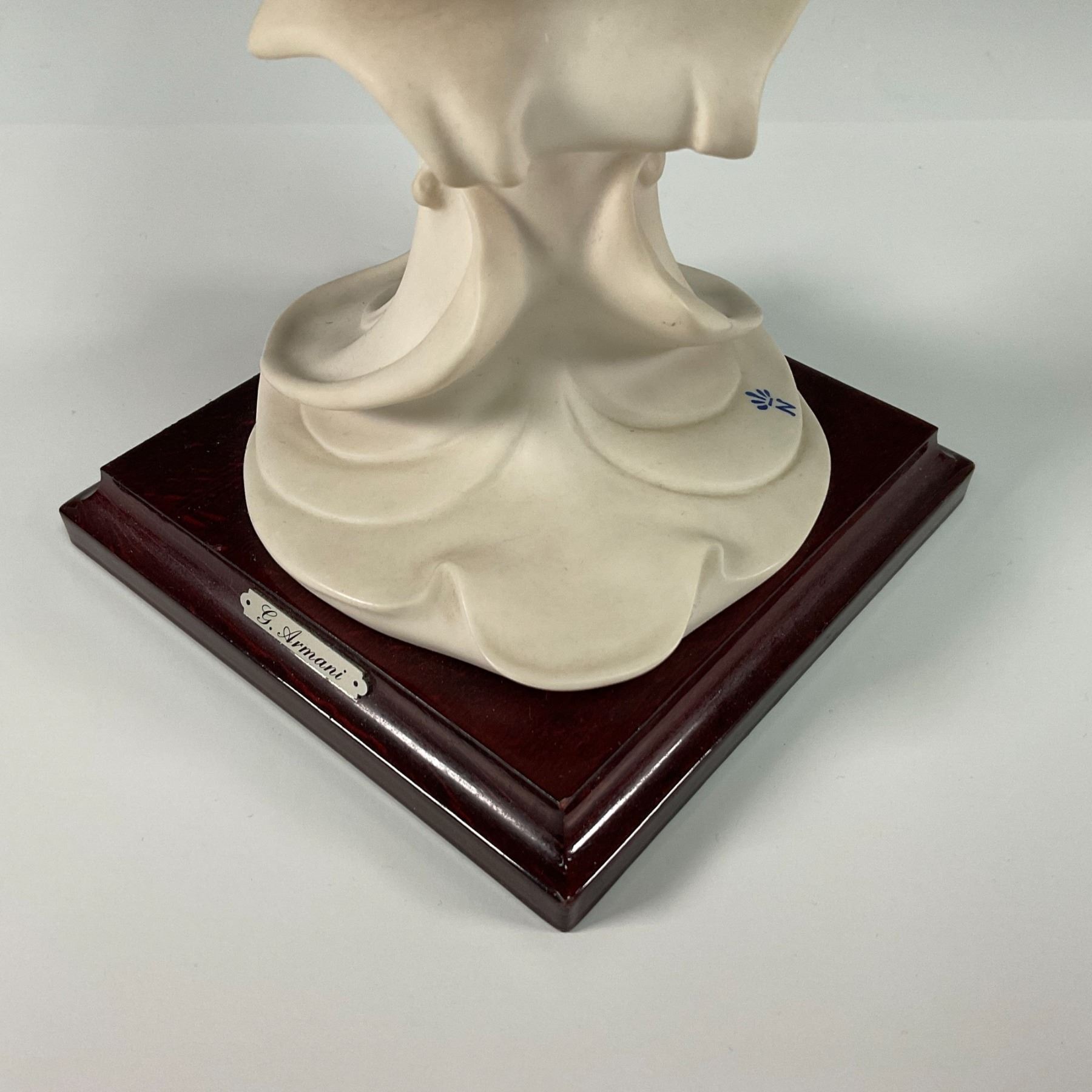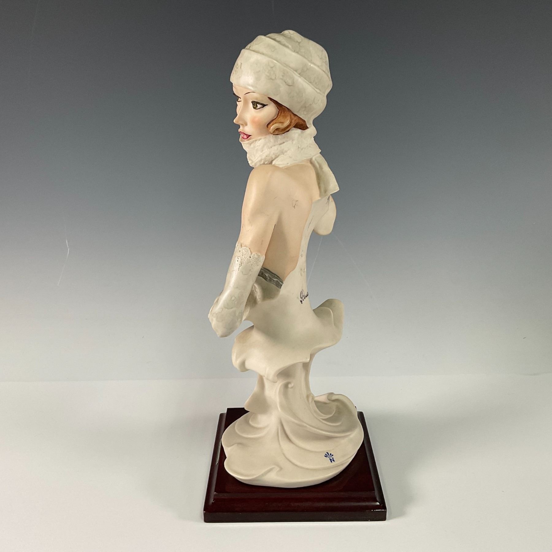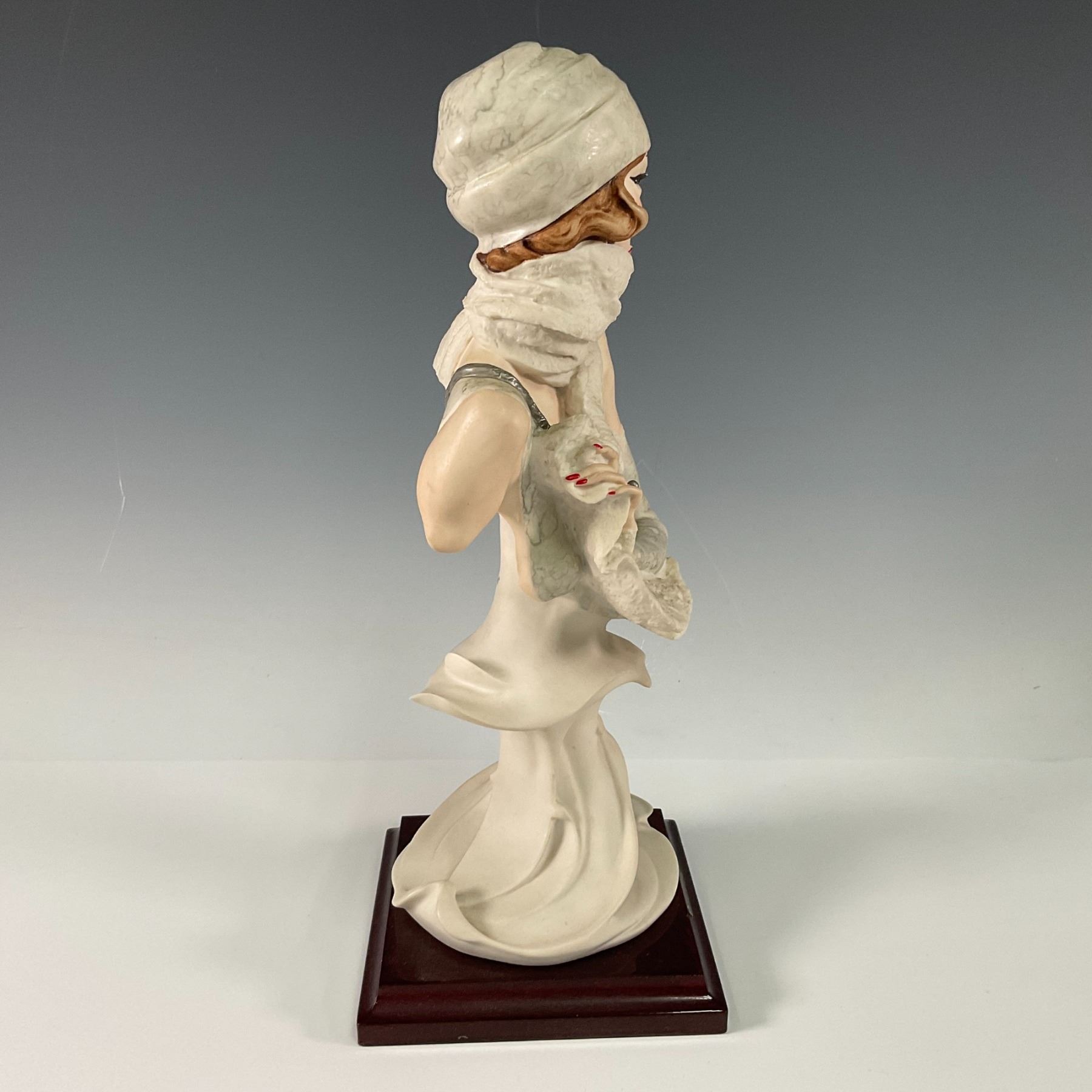 This exquisite sculpture by Giuseppe Armani captures the timeless elegance of a refined lady dressed in 1920s attire. With intricate detailing, the figure features a flowing scarf, gloves, and a stylish hat, all rendered in a soft, creamy palette. The sculpture rests on a polished wooden base with a Giuseppe Armani nameplate and is signed by the artist. Armani's exceptional craftsmanship and ability to evoke beauty and sophistication are evident in every detail of this piece, making it a stunning addition to any collection.