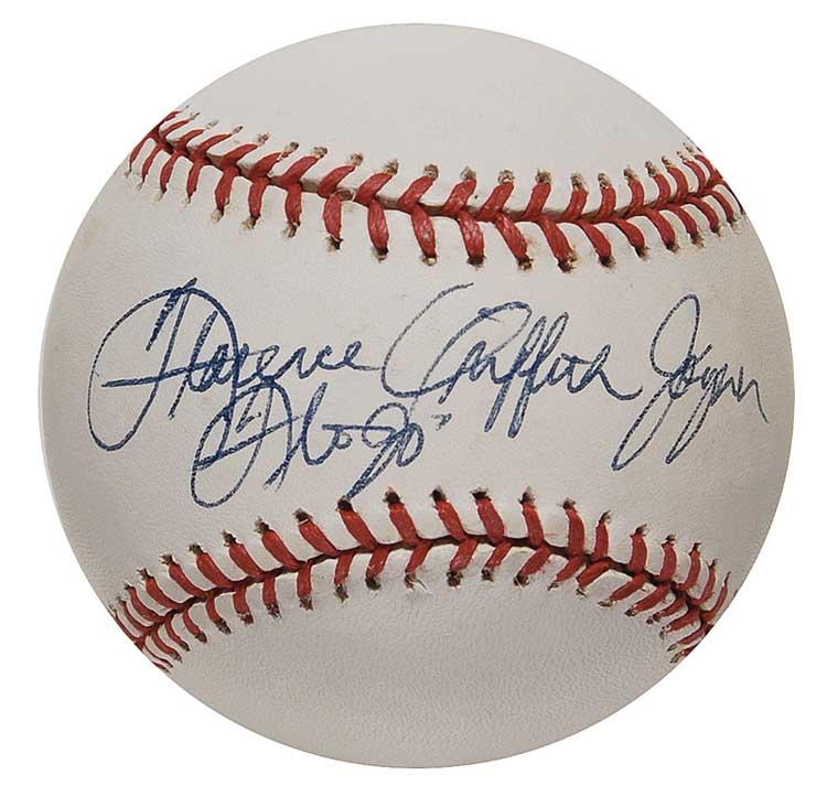 Official Rawlings National League baseball signed in blue ballpoint on the sweet spot, “Florence Griffith Joyner, ‘Flo Jo.’” In fine condition, with a bit of scattered light toning. Pre-certified Steve Grad/PSA/DNA and RRAuction COA.