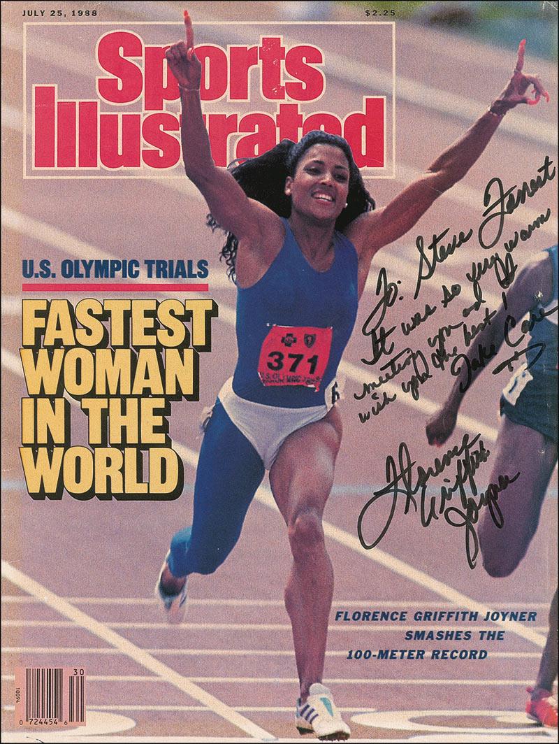 Flashy Olympic medal-winning tack and field athlete (1959-1998). However, her career was also dogged by allegations of drug use, which was speculated to have caused her premature death until the autopsy determined that it was due to a congenital defect. Magazine cover from the July 25, 1988 issue of Sports Illustrated, proclaiming Griffith-Joyner the “Fastest Woman in the World,” signed and inscribed in black felt tip. In fine condition, with some light edge and corner tip creasing. Pre-certified Steve Grad/PSA/DNA and RRAuction COA.
