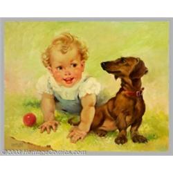 Florence Kroger - Original Calendar Art (c.1930).Published by the Joseph C. Hoover and Sons Calendar Company, Philadelphia.Oil on canvas, approximately 20 x 25. Signed lower left.A small published version of the art, still attached to the painting's original brown wrapping paper, is included. keywords: baby, dachshund, illustrator, illustration, children, toddlers, babies, pets, dog 2 items Important notice: Heritage usually auctions material at the rate of 200-250 lots per hour. On some occasions eBay Live bid software or the Internet may not be able to keep up with the pace of the auction. We recommend placing a realistic absentee bid now as insurance to avoid disappointment. Occasionally the auctioneer may eliminate or reject an eBay Live bid, and the auctioneer may also reopen a lot after the close of the eBay live bidding (usually because we missed an audience bid), and may reject your bid even if it shows you as the winning bidder. By bidding via eBay Live, you agree that Heritage may award the lot to another bidder at its sole discretion under the circumstances described above or any other reasonable circumstances. Also please note that all Heritage lots purchased through eBay Live carry a 20% Buyer's Premium. Please make sure you read the Terms and Conditions before you bid.