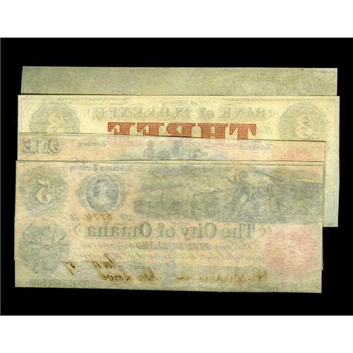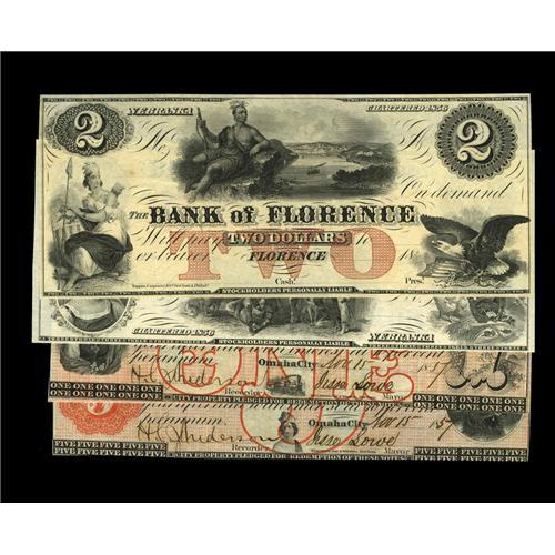 <B>Florence, NE- Bank of Florence</B></I> $2, $3 18__ G4a, G6a <B>Choice CU</B></I><BR><B>Omaha City, NE- City of Omaha</B></I> $1, $5 Nov. 15, 1857 <B>XF-AU.</B></I><BR>All four of these notes harken back to Nebraska's territorial days.