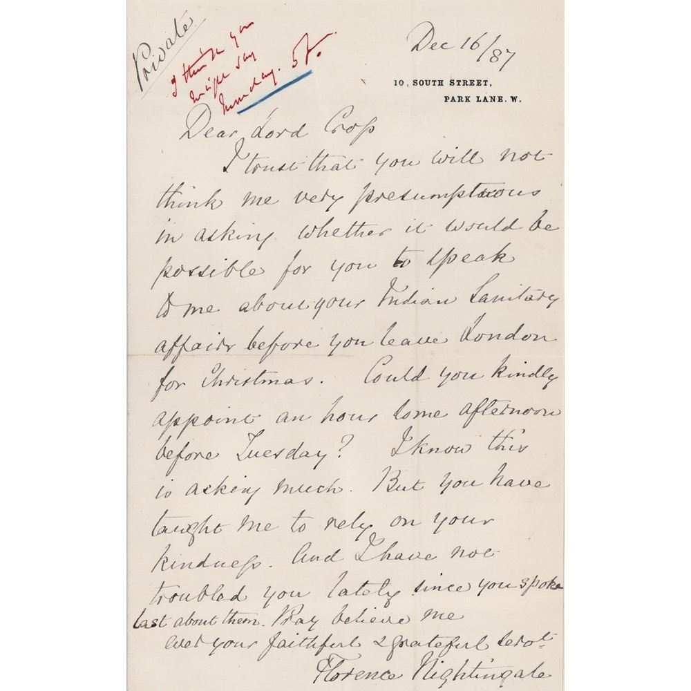 ALS, one page, 5 x 8, 10 South Street letterhead, December 16, 1887. Handwritten letter to Lord Cross, in part: "I trust that you will not think me very presumptuous in asking whether it would be possible for you to speak to me about your Indian Sanitary affair before you leave London for Christmas. Could you kindly appoint an hour some afternoon before Tuesday? I know this is asking much. But you have taught me to rely on your kindness." In fine condition. R. A. Cross, 1st Viscount Cross, was a British statesman and Conservative politician who served as Secretary of State for India from 1886 to 1892. He also notably served as Home Secretary between 1874–1880 and 1885–1886, and oversaw the passage of the Indian Councils Act of 1892.