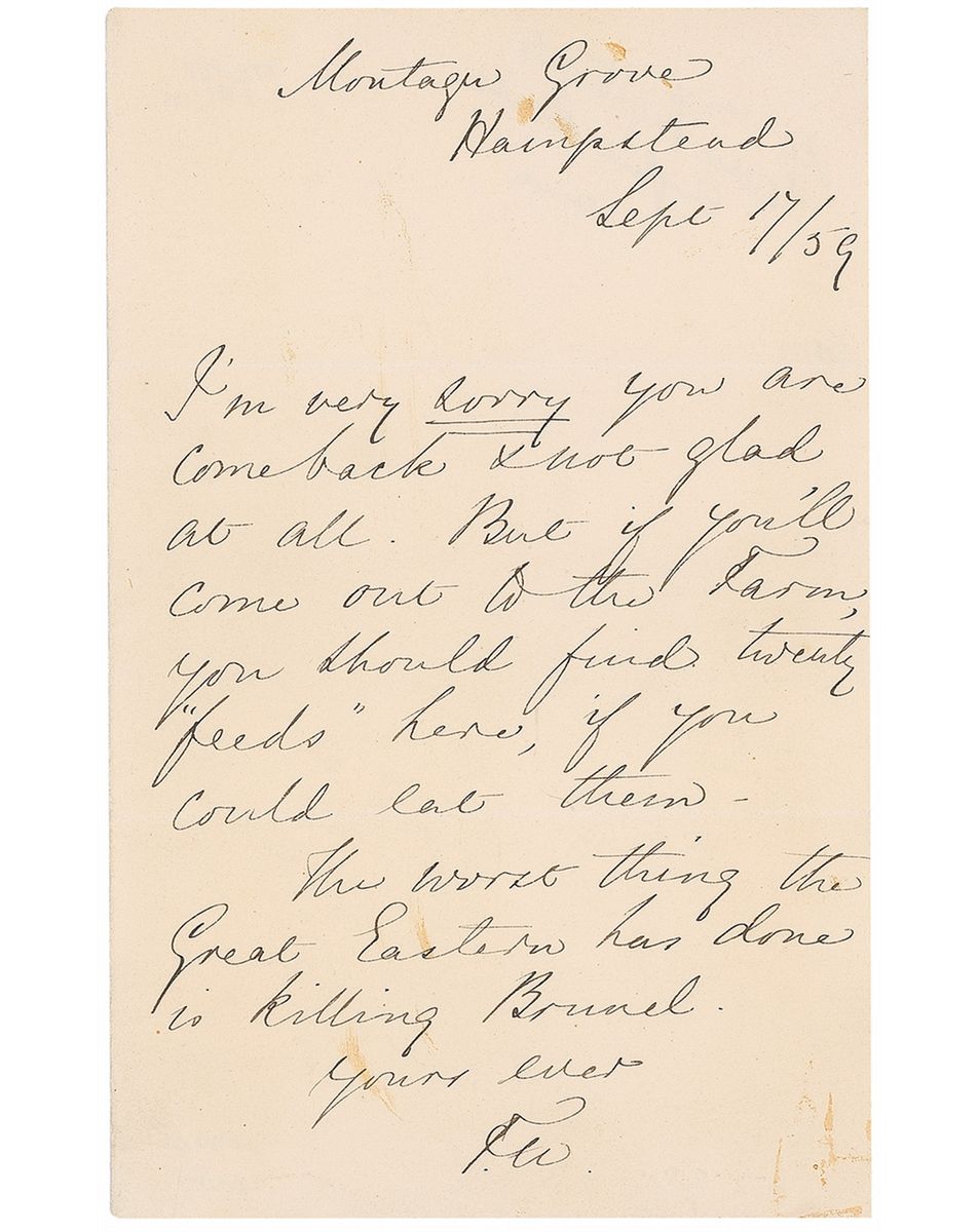Italian-born British nurse (1820–1910), popularly known as the ‘Lady with a Lamp,’ who first came to prominence for her care of troops during the Crimean War. She pioneered modern nursing and hospital practice, and her prowess as a mathematician led her to develop a number of important innovations in the field of statistics. ALS signed “F. N.,” one page, 4.25 x 7, September 17, 1859. Letter to an unidentified recipient. In part: “I’m very sorry…But if you’ll come out to the farm, you should find twenty ‘feeds’ here, if you could eat them. The worst thing the Great Eastern has done is killing Brunel.” Scattered light spotting to page, not affecting legibility, otherwise fine condition.