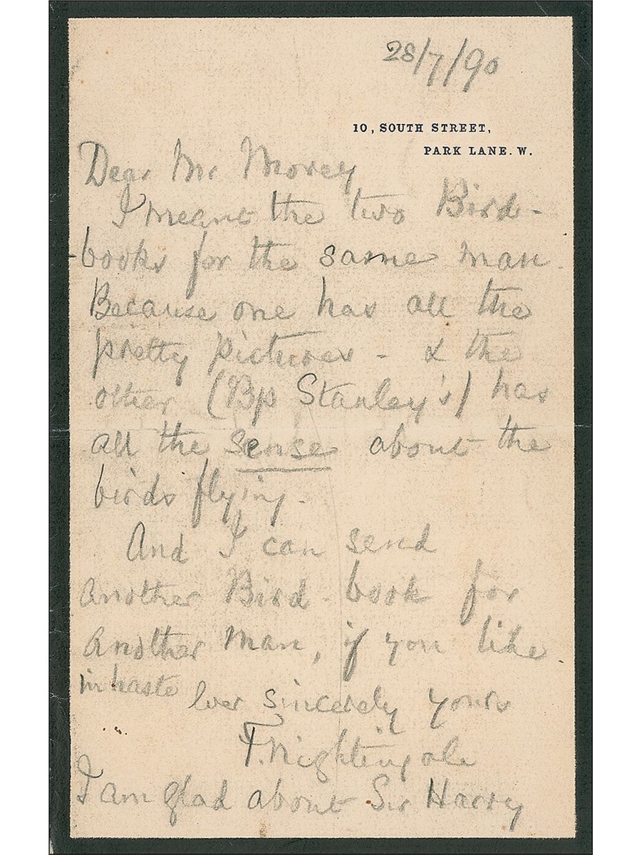 ALS, in pencil, signed “F. Nightingale,” one page, 4.5 x 7, black-bordered personal letterhead, July 28, 1890. Letter to Mr. Morey. In part: “I meant the two Bird books for the same man. Because one has all the pretty pictures—& the other (By Stanley’s) has all the sense about the birds flying.” In very good condition, with light overall soiling and a central horizontal fold.