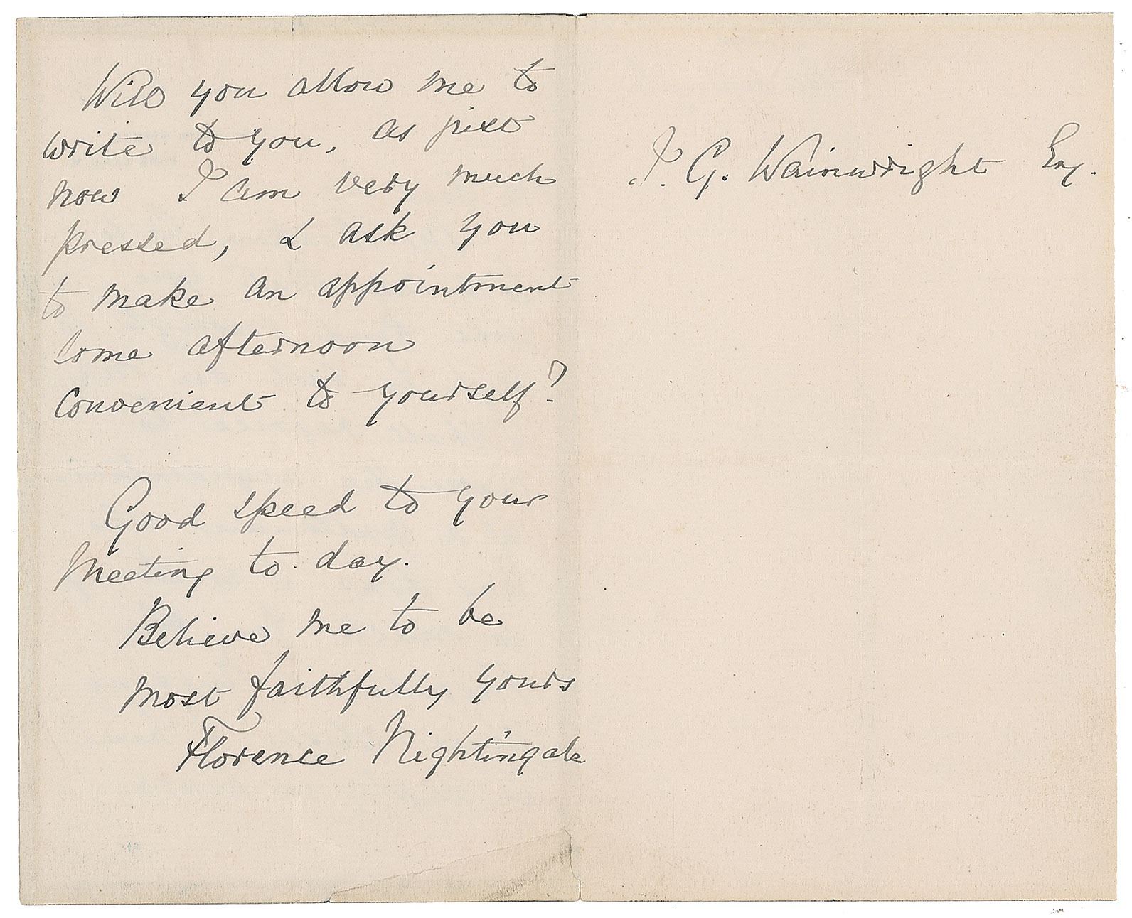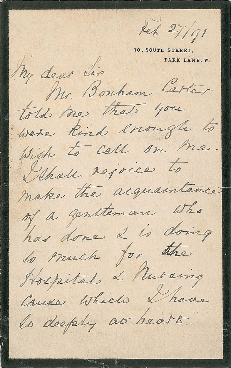 ALS, one page both sides, 4.25 x 7, black-bordered 10 South Street letterhead, February 17, 1891. Letter to J. G. Wainwright, the treasurer of St. Thomas' Hospital, in full: "Mr. Bonham Carter told me that you were kind enough to wish to call on me. I shall rejoice to make the acquaintance of a gentleman who has done & is doing so much for the Hospital & Nursing cause which I have so deeply at heart. Will you allow me to write to you, as just now I am very much pressed, & ask you to make an appointment some afternoon convenient to yourself? Good speed to your meeting to day." In very good to fine condition, with a crease, and short tear, to the lower left corner.