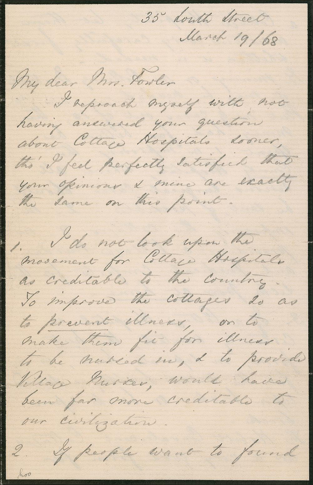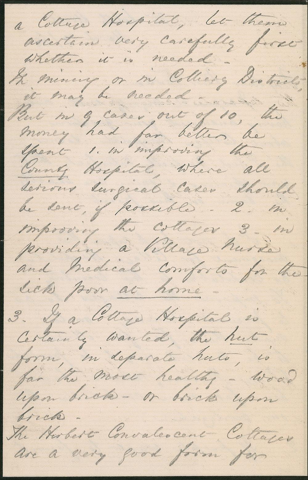 1. I do not look upon the movement for Cottage Hospitals as creditable to the country. To improve the cottages as to prevent illness, or to make them fit for illness to be nursed in, & to provide Village Nurses, would have been far more creditable to our civilization.