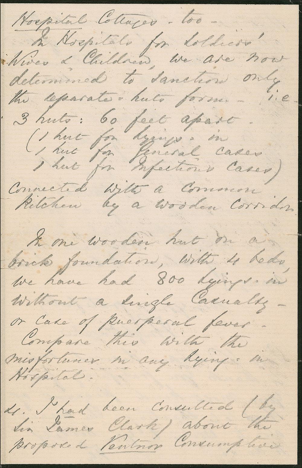 In Hospitals for Soldiers’ Wives & Children, we are now determined to sanction only the separate hut form—i.e. 3 huts: 60 feet apart…connected with a common kitchen by a wooden corridor …