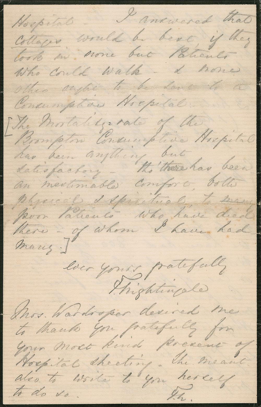 [The Mortality rate of the Brompton Consumptive Hospital has been anything but satisfactory–tho’s there has been an inestimable comfort both physical & spiritual to many poor patients who have died there—of whom I have had many.]