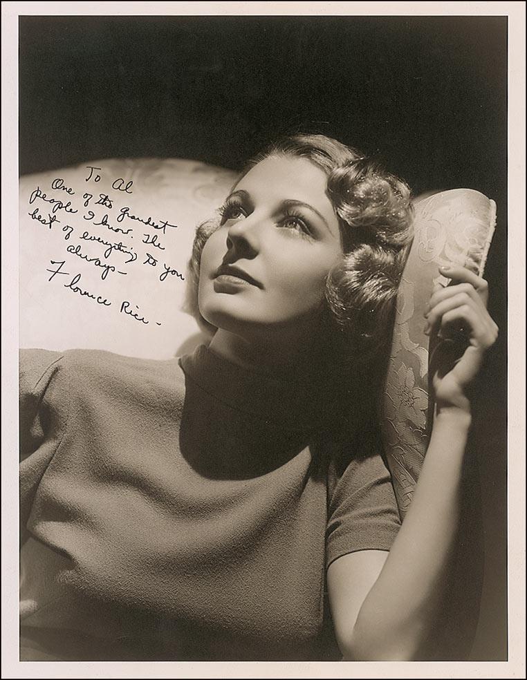 Beautiful vintage matte-finish 10 x 13 MGM publicity photo credited to Clarence Bull, signed and inscribed, “To Al, One of the grandest people I know. The best of everything to you always–Florence Rice.” In fine condition.