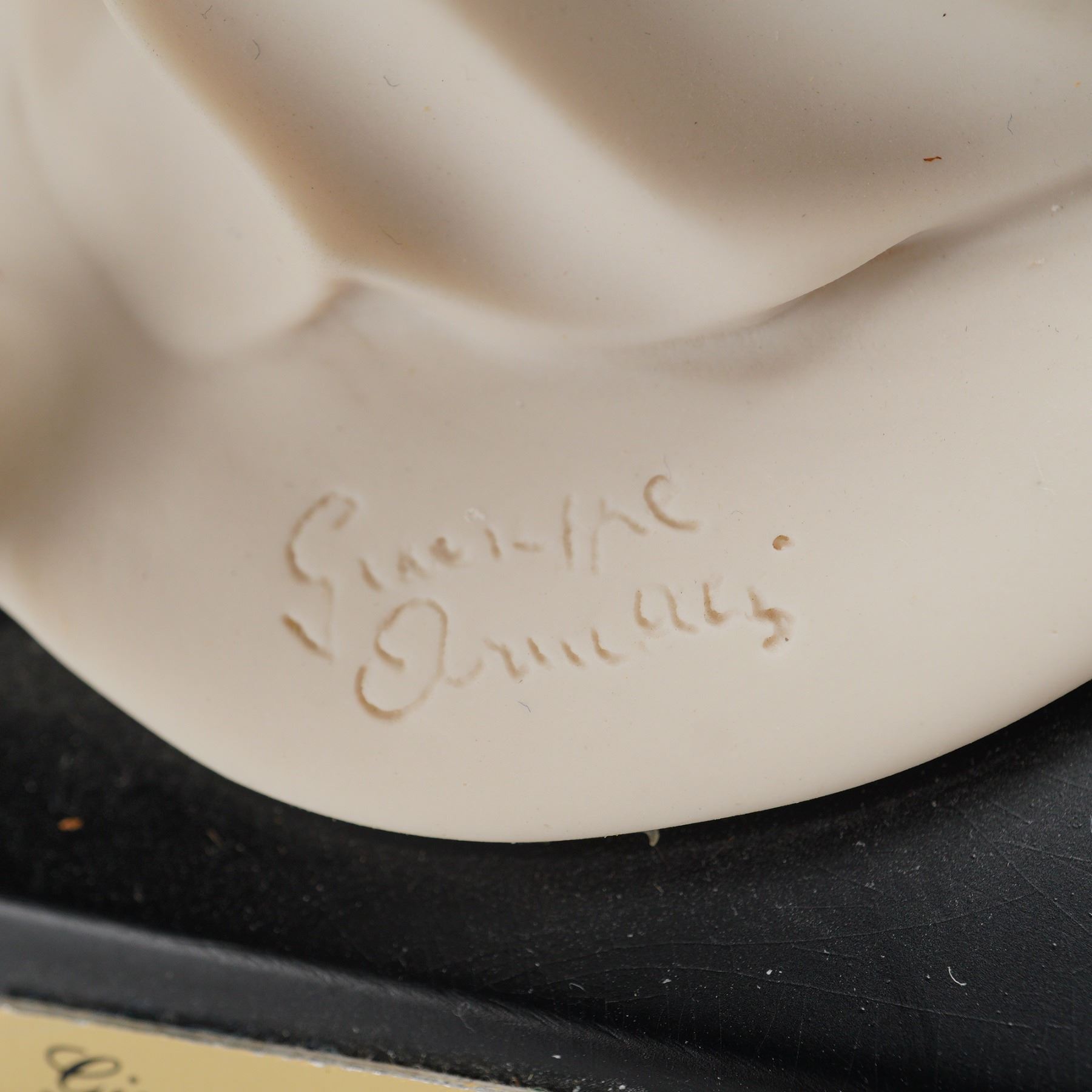 Elegant hand-painted porcelain figurine depicting a refined woman draped in a flowing shawl, posed gracefully with one hand resting on her hip and the other holding a flower. Signed on the base, with copyright mark dated and Florence factory stamp, mounted on a black base with a nameplate. This item has its original box.