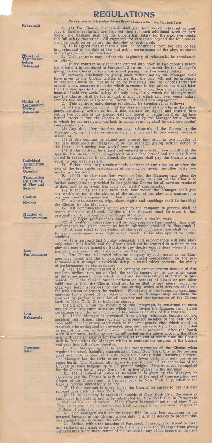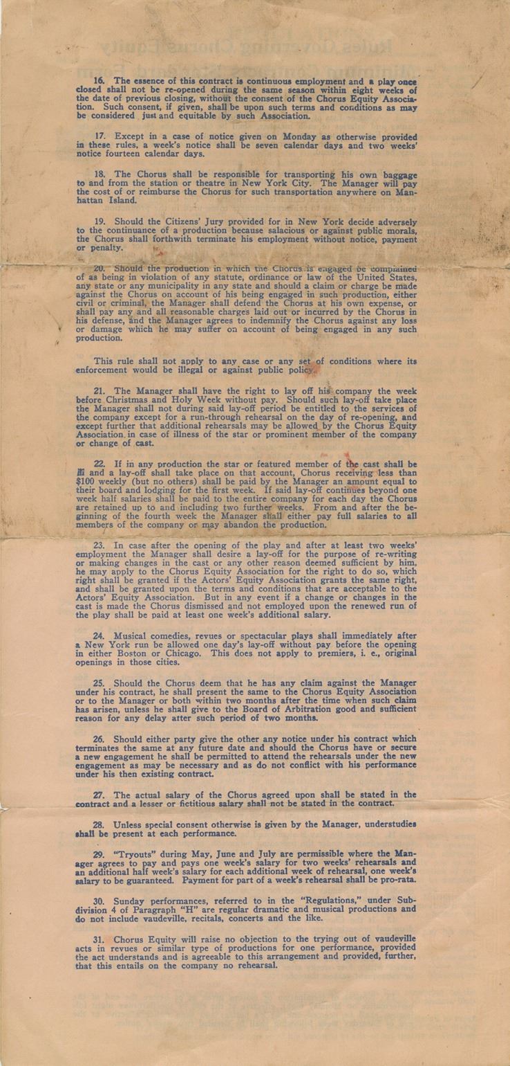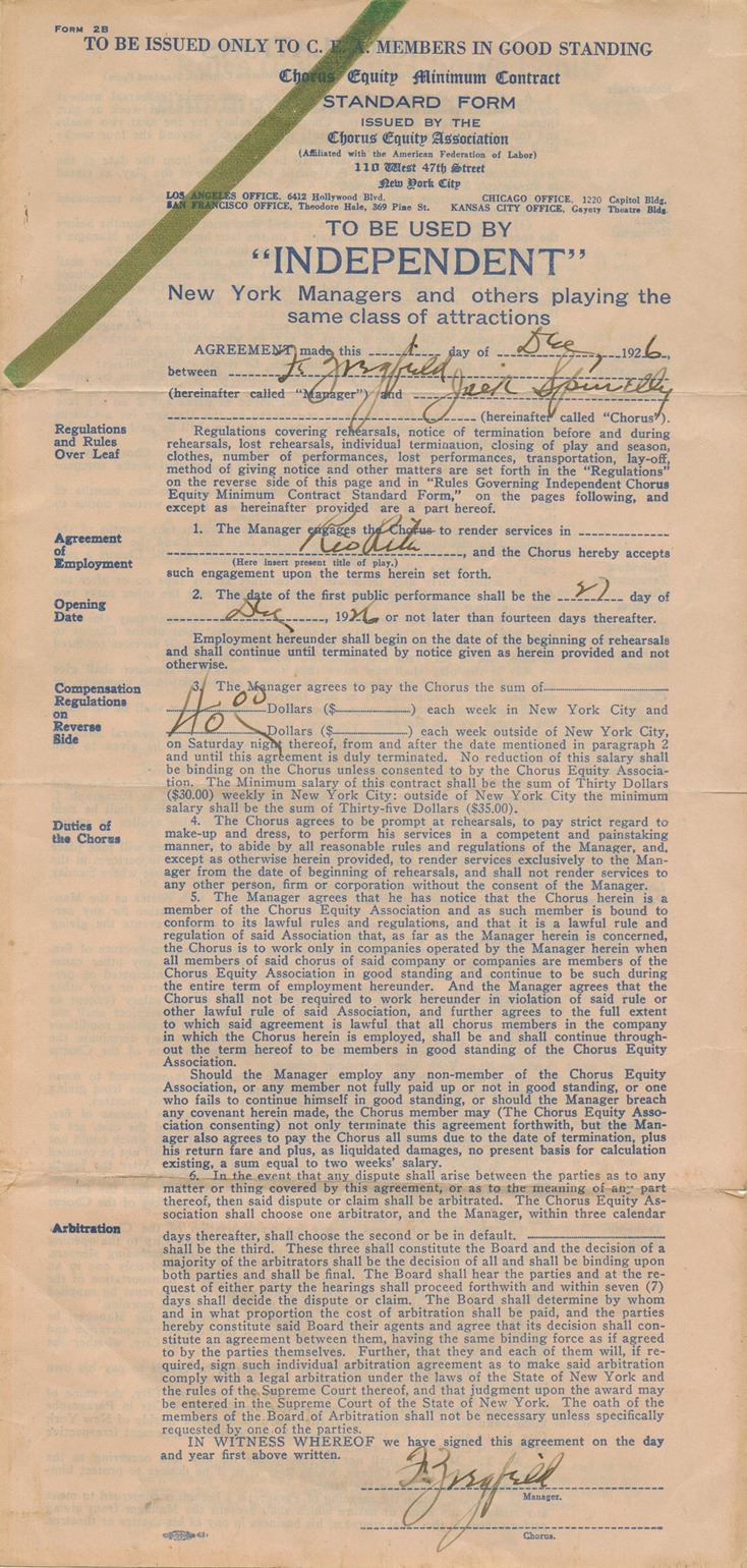 175. * Florenz Ziegfeld contract signed ("F. Ziegfeld"), 1-page (6.9 x 14 in.; 175 x 356 mm) standard "Chorus Equity Minimum Contract", dated 6 December 1926, hiring Jack Spinelly for employment in the chorus for Rio Rita. Slight toning with minor separation at folds.