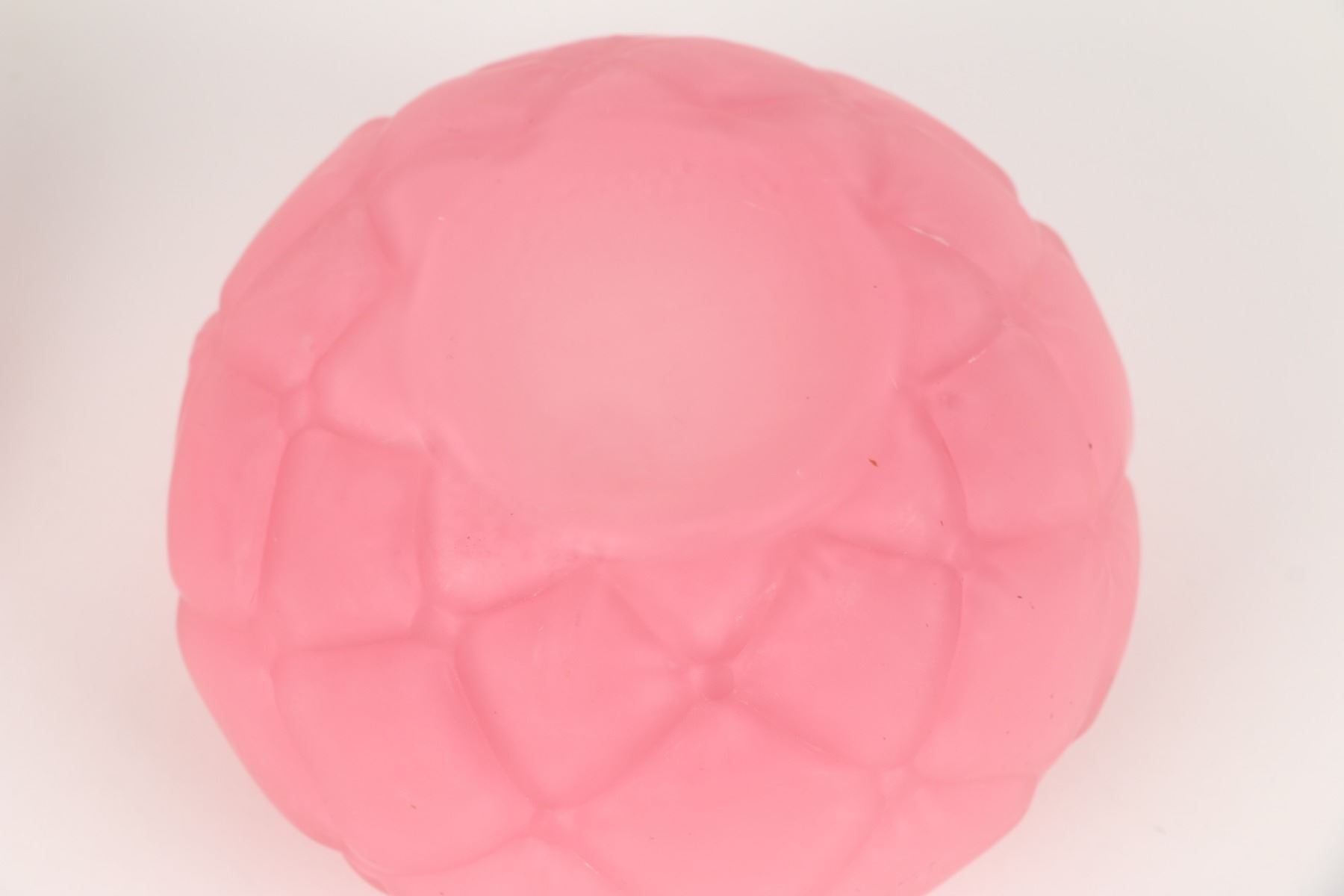 Lot 424 - Three (3) pieces. Includes satin cased glass, butter, creamer, sugar. Butter base 7.5" dia. Sugar with a few rim flakes where ground lid meets base, possibly as made. One flea bite on finial side, butter base. $50-100.