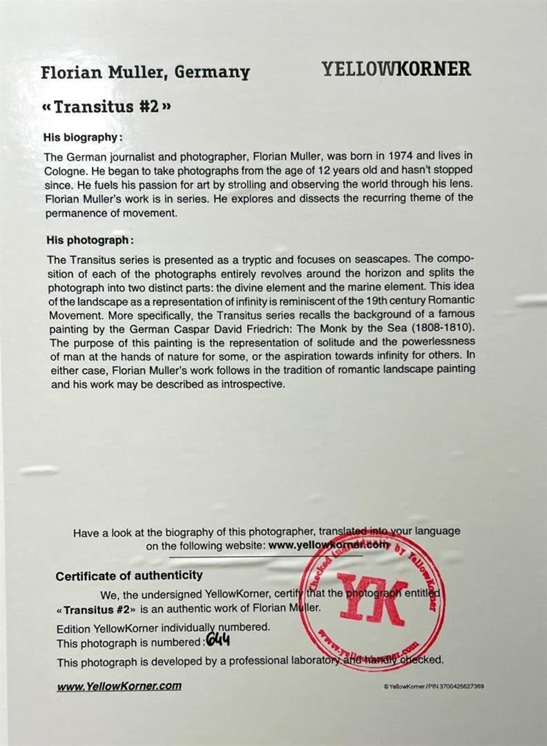 Florian Muller Germany Transitus #2 YellowKorner Certified Photograph. Certificate of Authenticity from YellowKorner affixed to the back. Matted Dimensions 16"x20". Protected with Clear Mylar Sleeve.